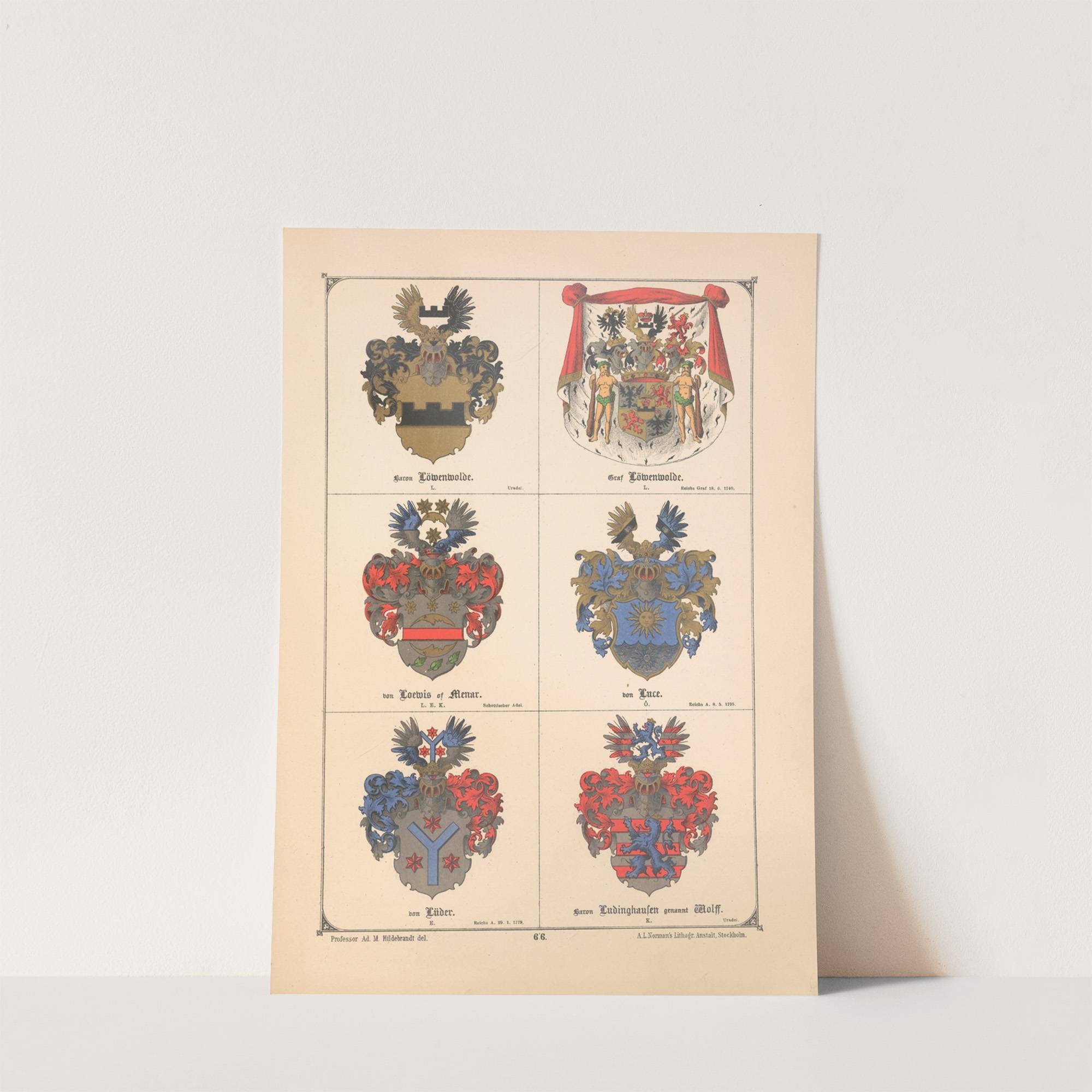 This art print showcases six elaborate coat of arms designs from the Baltische Wappenbuch by Adolf Matthias Hildebrandt (1882). Each armory features rich, vibrant colors and intricate details.The top-left design features a golden shield adorned with blue feathers, crowned with...