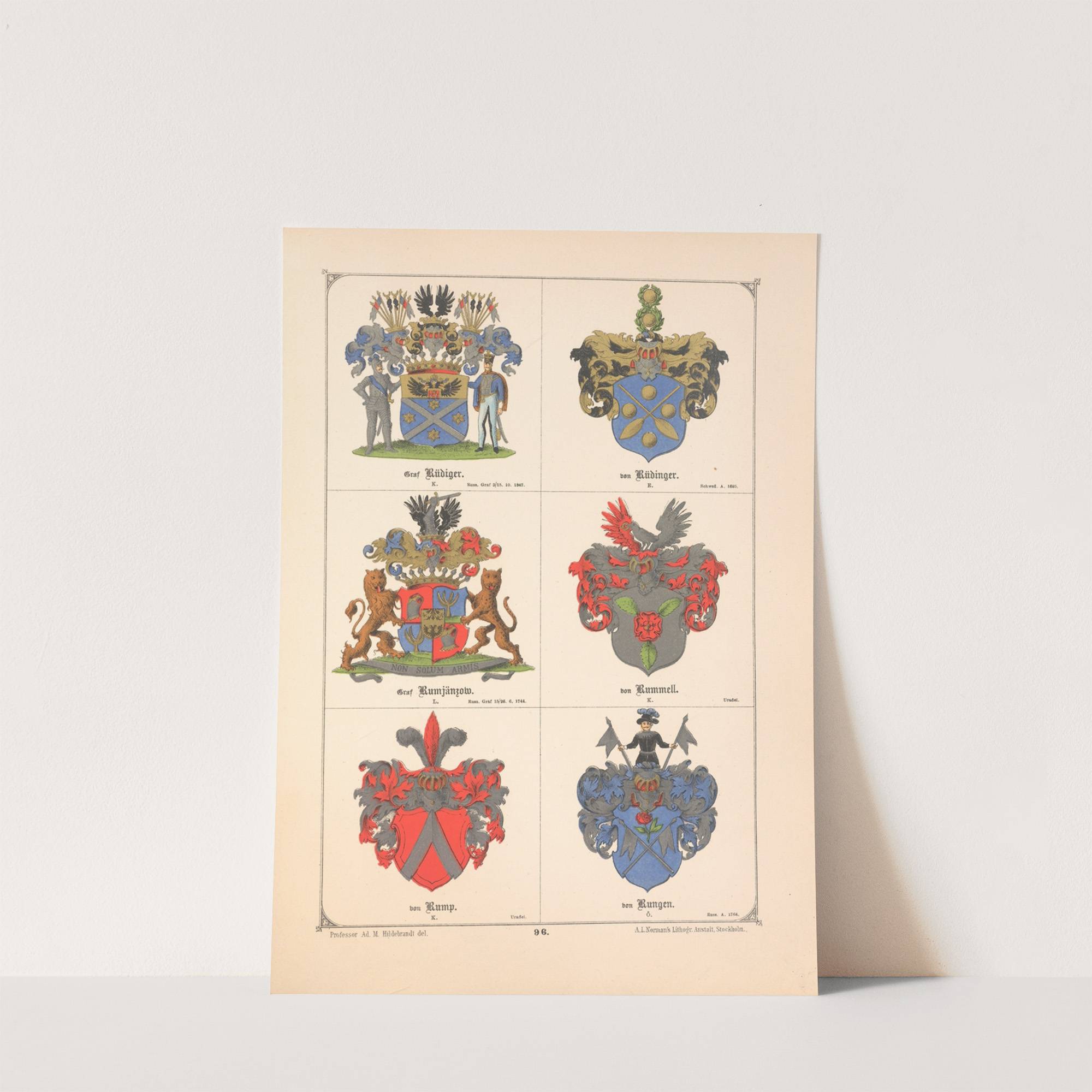 This art print showcases six intricate coats of arms, each adorned with vibrant colors and elaborate designs. The top left features the "Brandenburg" coat of arms, showcasing a crowned lion and eagle standing amidst gold, blue, and white elements. The...