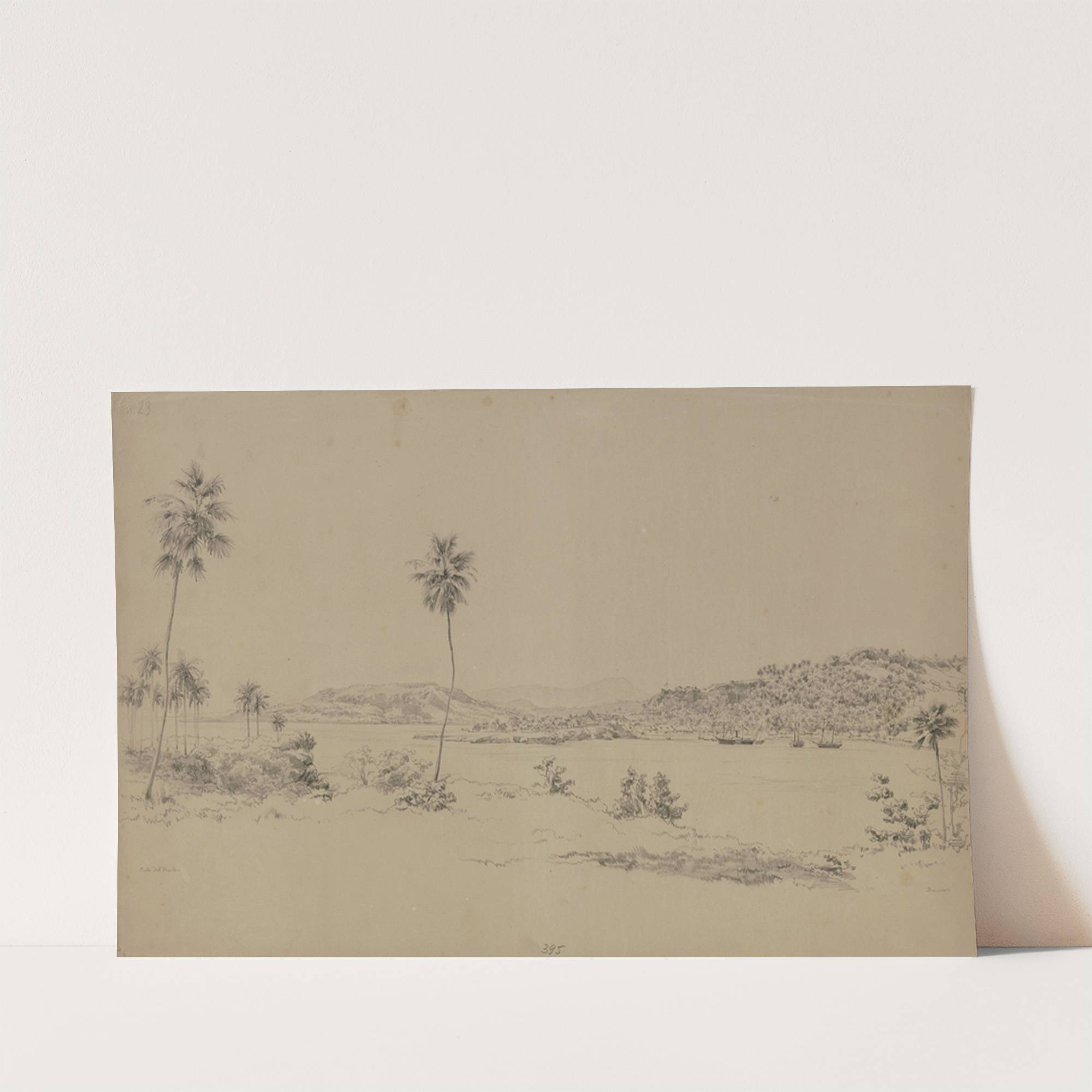 This art print features "Baracoa mit Punta del Fraile" by Adolf Höffler, showcasing a serene tropical landscape. The monochromatic illustration, rendered in delicate pencil, captures the gentle curves and slender forms of tall palm trees scattered across an expansive open...
