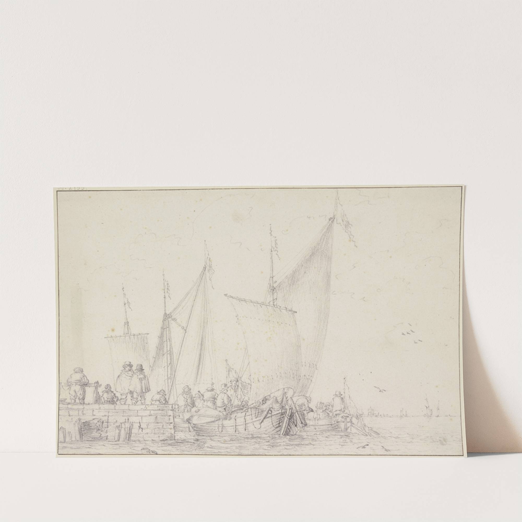 Barken liegen an einem gemauerten Quai, auf welchem mehrere Figuren stehen by Simon de Vlieger - Wall Art Print