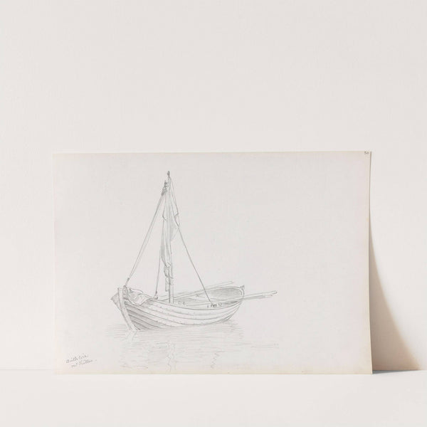 This black-and-white line drawing captures a serene sailing boat at sea. The minimalist style uses fine, deliberate lines to depict the gentle curves of the wooden hull and the billowing sailcloth, which stands tall against an empty white background. Soft...