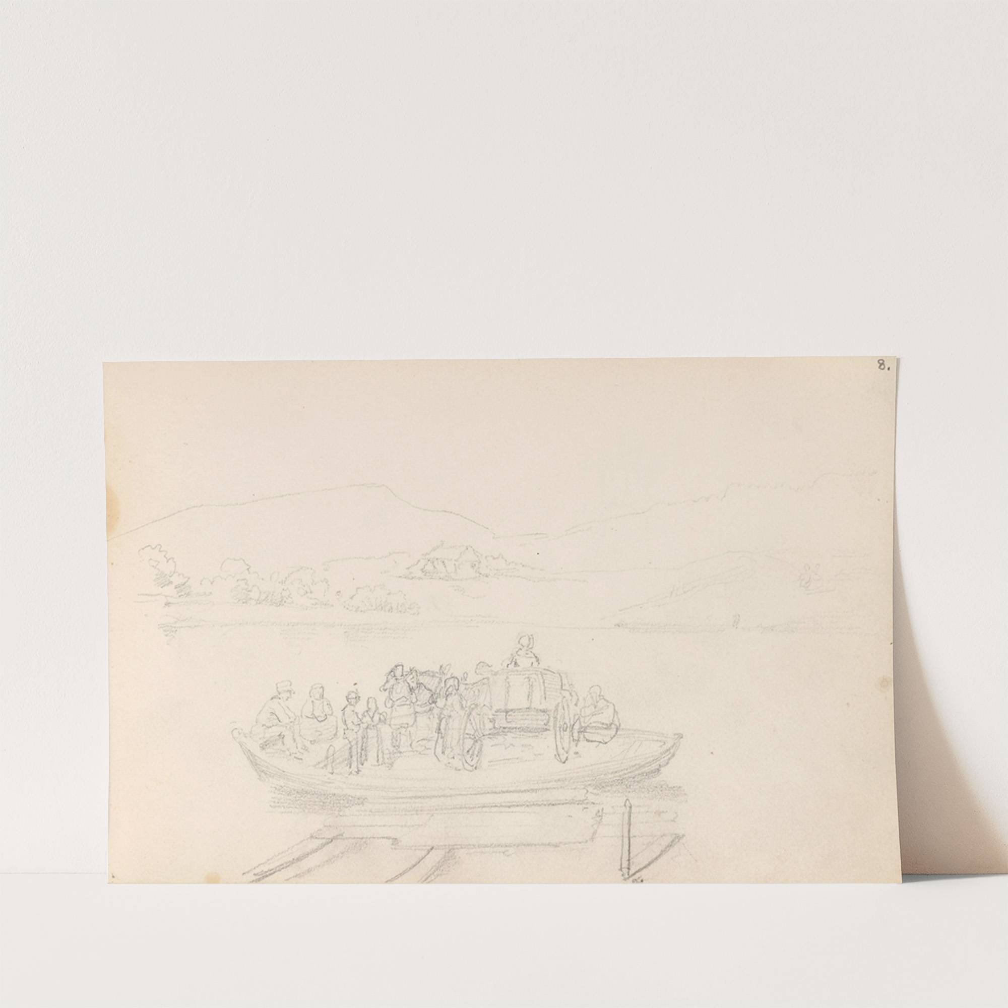 This artwork is "Båt med hest, vogn og figurer, Vormsund" by Adolph Tidemand, created in 1852. It is a minimalist line drawing rendered in pencil on white paper. The composition features a boat populated with multiple human figures, situated slightly...