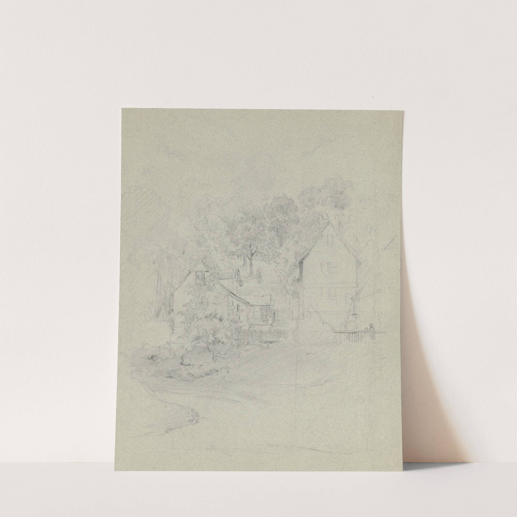 Bauernhäuser zwischen Bäumen, vorne ein Zaun, an welchem rechts zwei Kinder stehen by Jakob Fürchtegott Dielmann - Wall Art Print