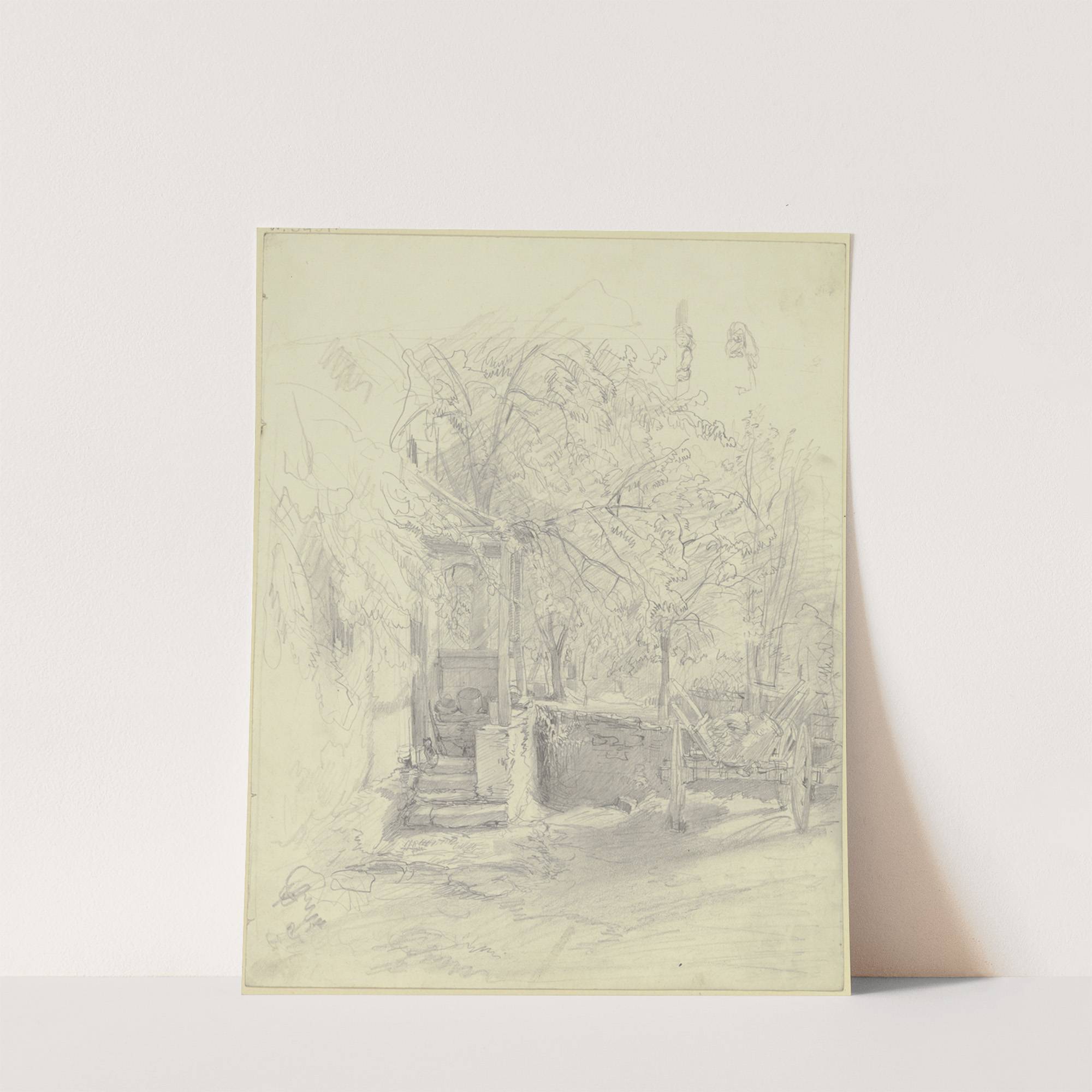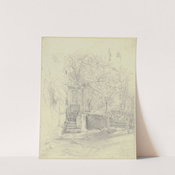 Bauernhof, links führt eine bedeckte Treppe ins Haus, rechts steht ein Wagen, im Hintergrund Bäume by Jakob Fürchtegott Dielmann - Wall Art Print