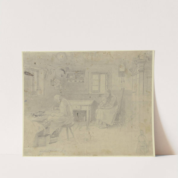 Bauernstube, links sitzt der Schuster an der Arbeit, rechts am Fenster die Frau mit dem Kind by Jakob Fürchtegott Dielmann - Wall Art Print