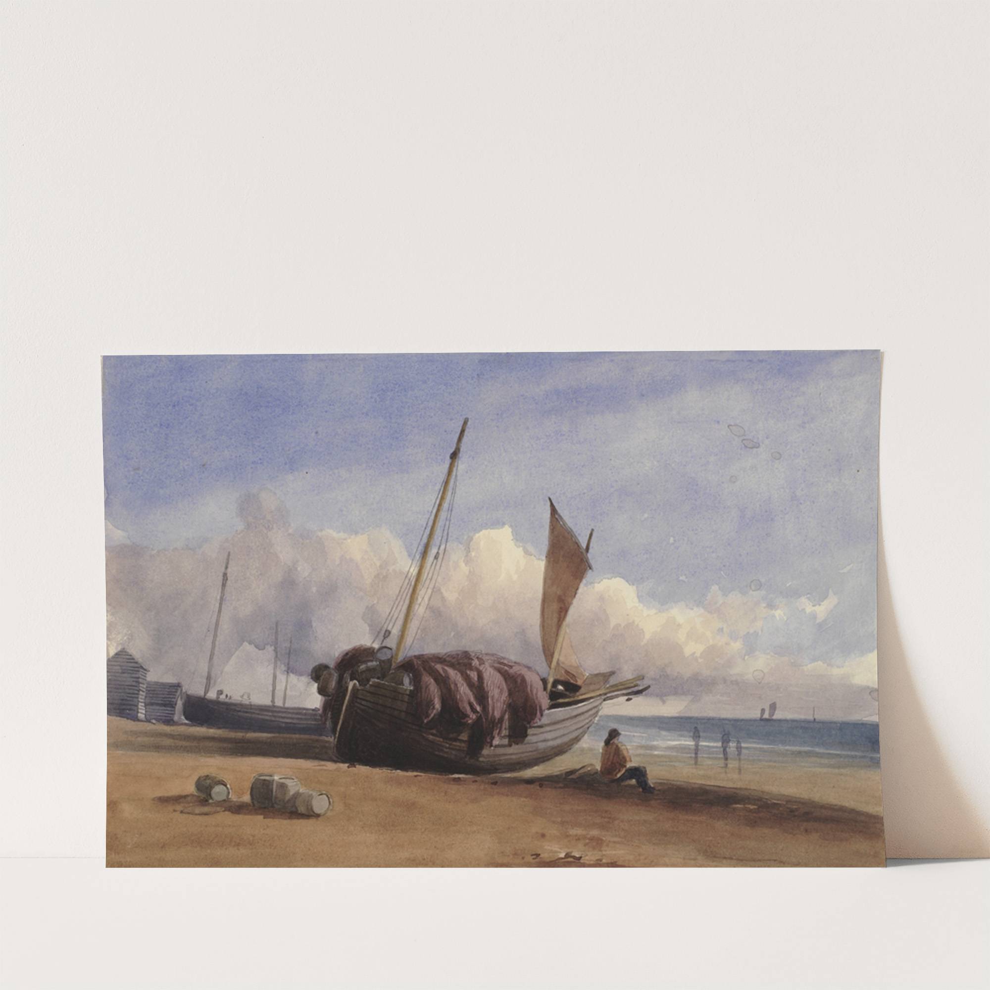 Beached fishing boat with seated fisherman by Charles Bentley - Wall Art Print