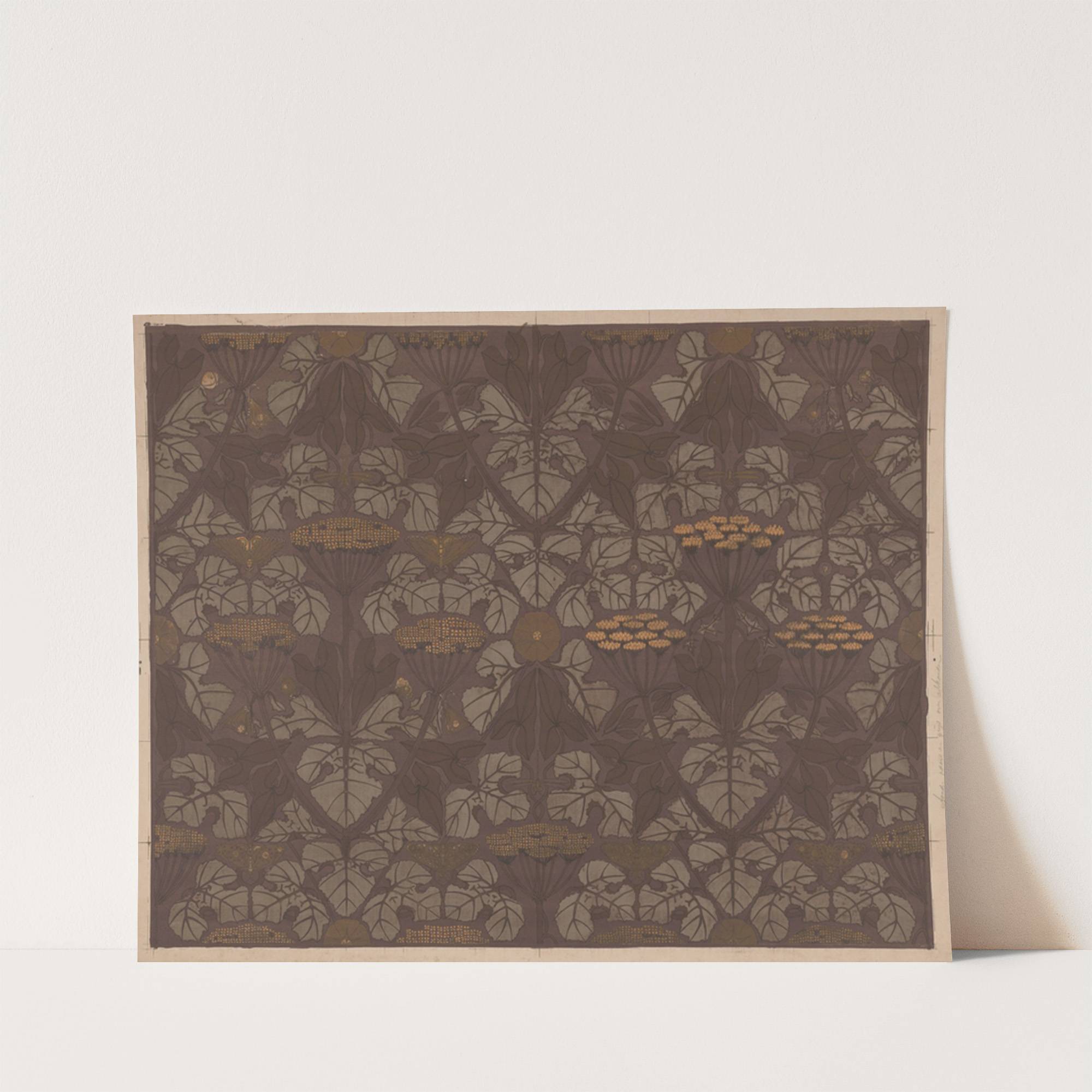 This artwork is "Behangselpapier met schermbloemen, vlinders en libellen" by Theo Nieuwenhuis, featuring an intricate and detailed botanical pattern. The composition showcases a repeating design of large, stylized leaves and flowers in dark purple hues, creating a rich and complex...