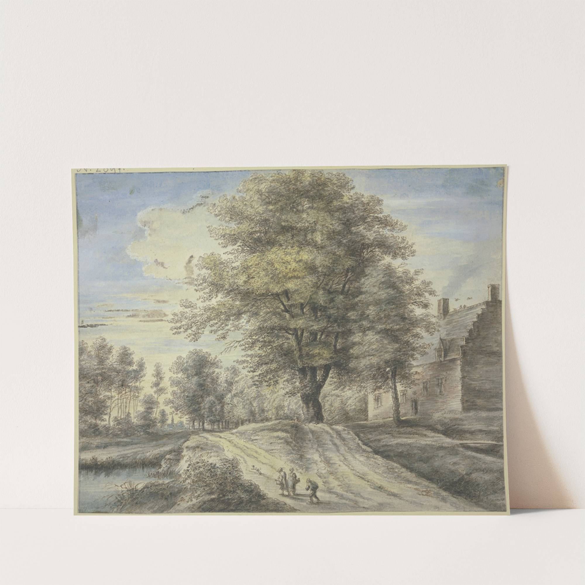 Bei einem Haus ein großer Baum, vorne drei Figuren und ein Hund by Lucas van Uden - Wall Art Print