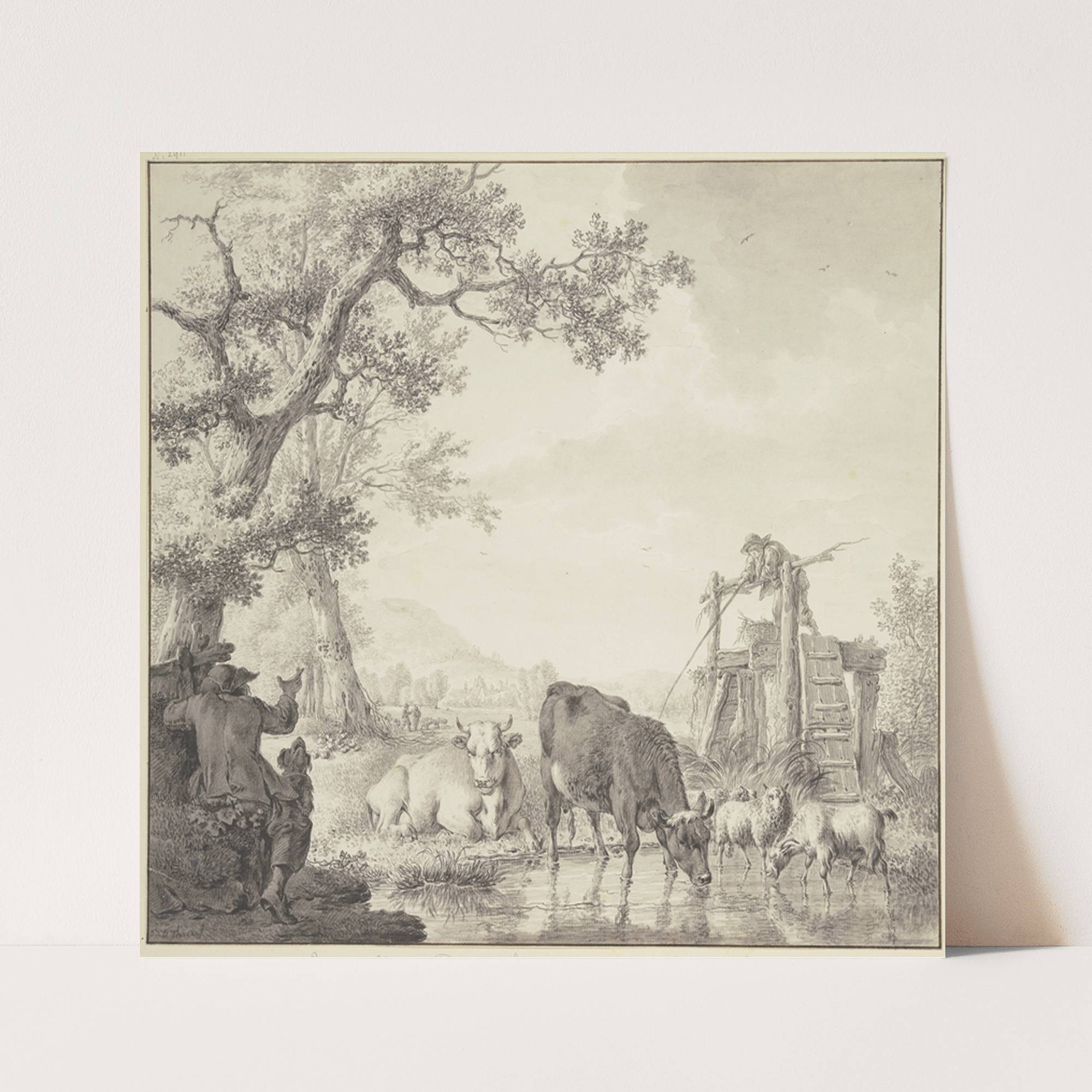 Bei einem Wasser zwei Kühe, zwei Pferde und eine Ziege, links der Hirte mit dem Hunde by Bernhard Hendrik Thier - Wall Art Print