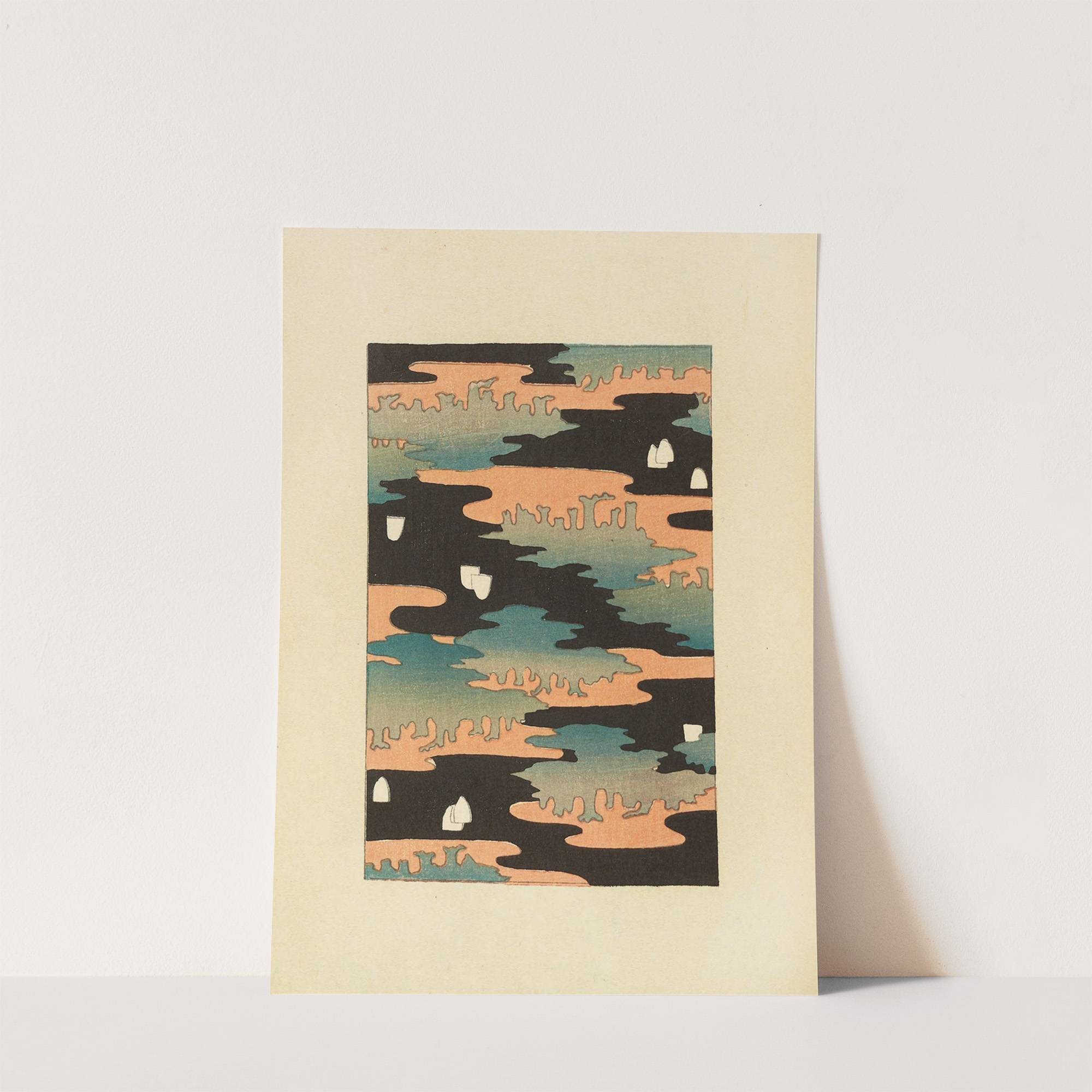 This vibrant print features an abstract, dynamic composition that showcases a captivating blend of colors and shapes. The artwork, "Bijutsukai Pl.35" by the artist Furuya Kōrin, employs a striking palette of black, teal, orange, and white. The central focus is...
