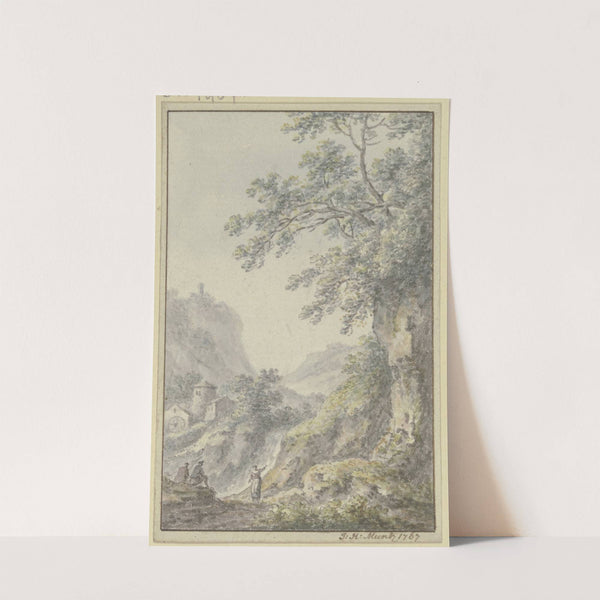 Blick in eine Berglandschaft mit einer Burg, im Vordergrund ein Hohlweg mit drei Figuren by Johann Heinrich Müntz - Wall Art Print