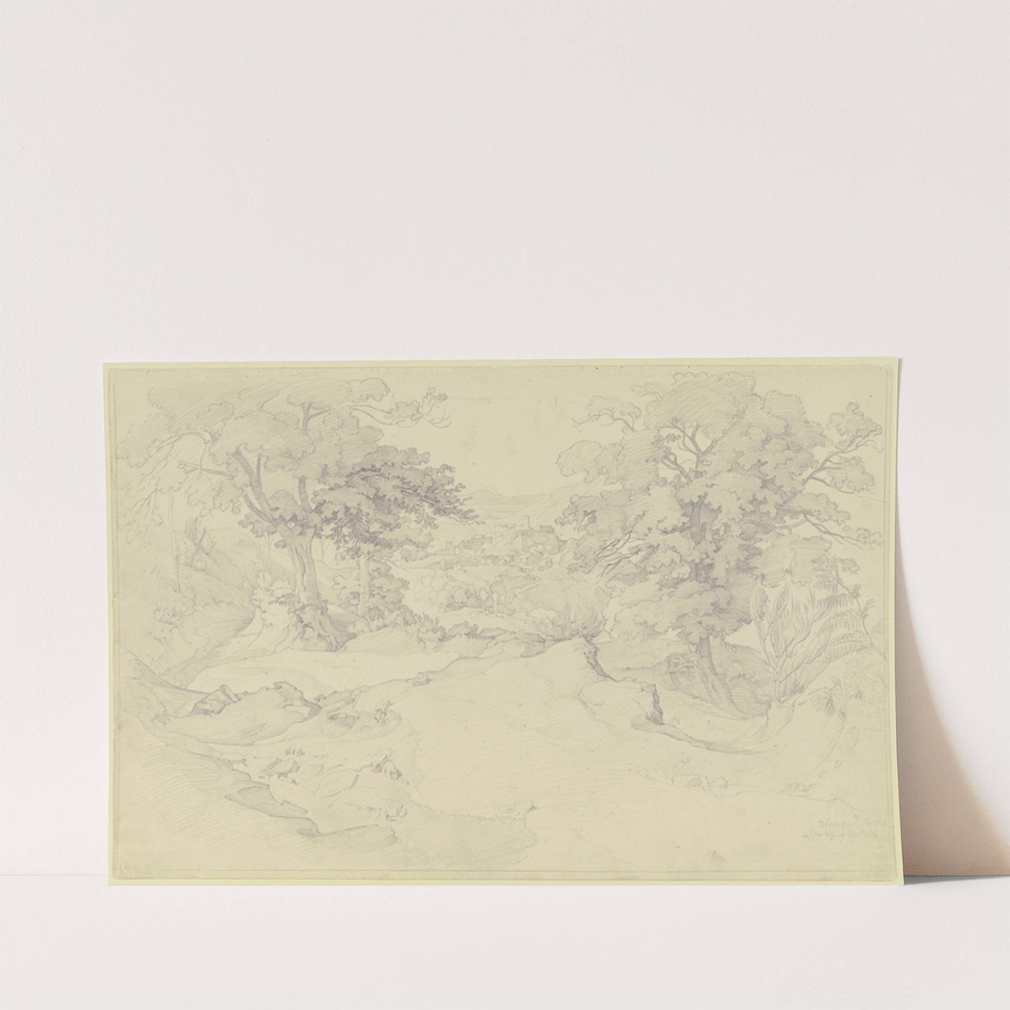 Blick zwischen Bäumen auf Olevano by August Lucas - Wall Art Print