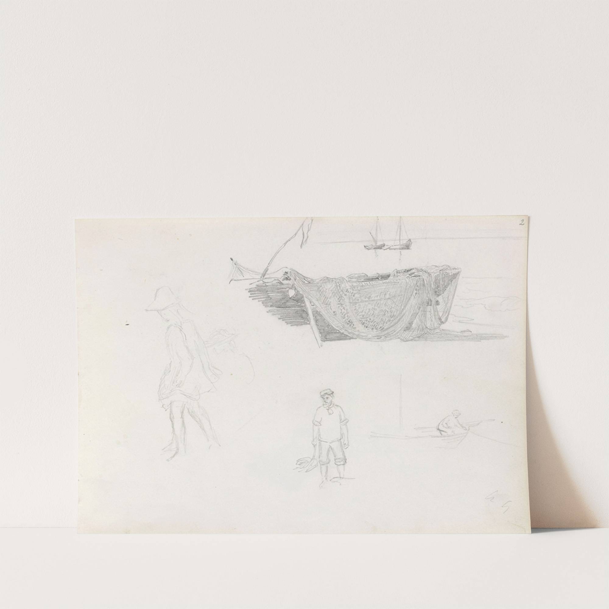 Boat with fishing nets; figure studies by Hans Gude - Wall Art Print