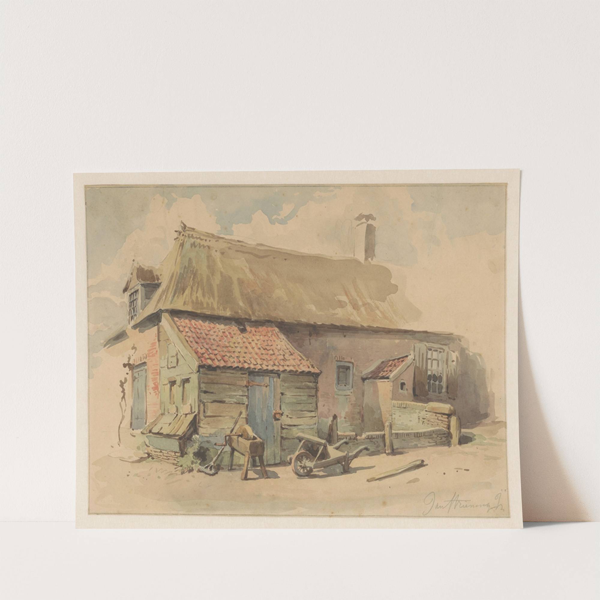 Boerenhuis met houten aanbouw, ervoor een kruiwagen en een slijpsteen by Jan Striening - Wall Art Print