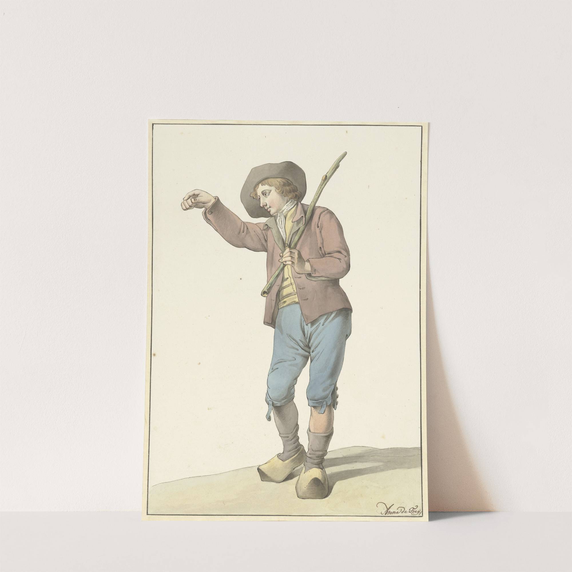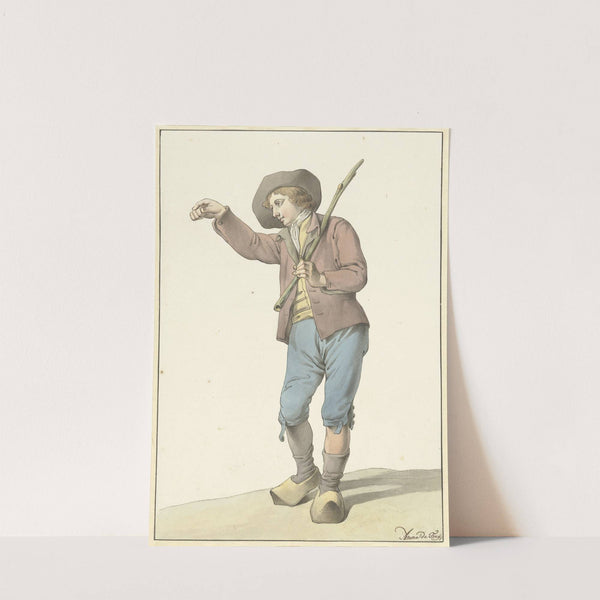 This charming watercolor illustration by Aletta de Freij portrays a young boy in traditional Dutch peasant attire, titled "Boerenjongen wijzend met de rechterhand." The boy stands with his right arm raised and slightly bent at the elbow, holding what appears...