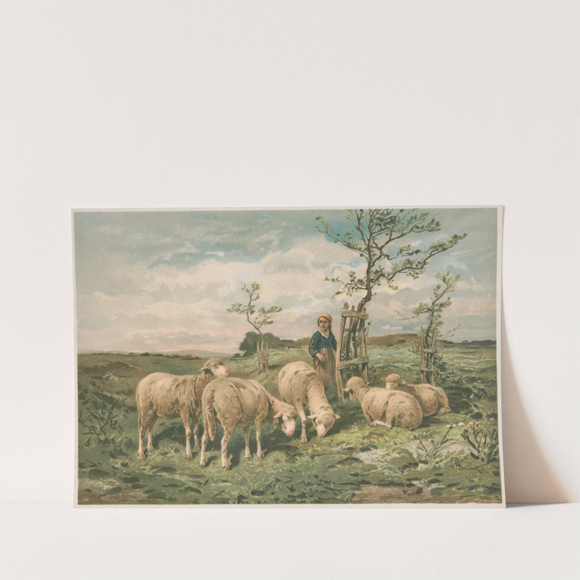 This charming print depicts "Bomen langs de Vaart bij de Woudsterweg" by Jan Mankes, capturing a serene pastoral scene in exquisite detail. In the foreground, a young boy with fair skin and blond hair stands among six sheep grazing peacefully...