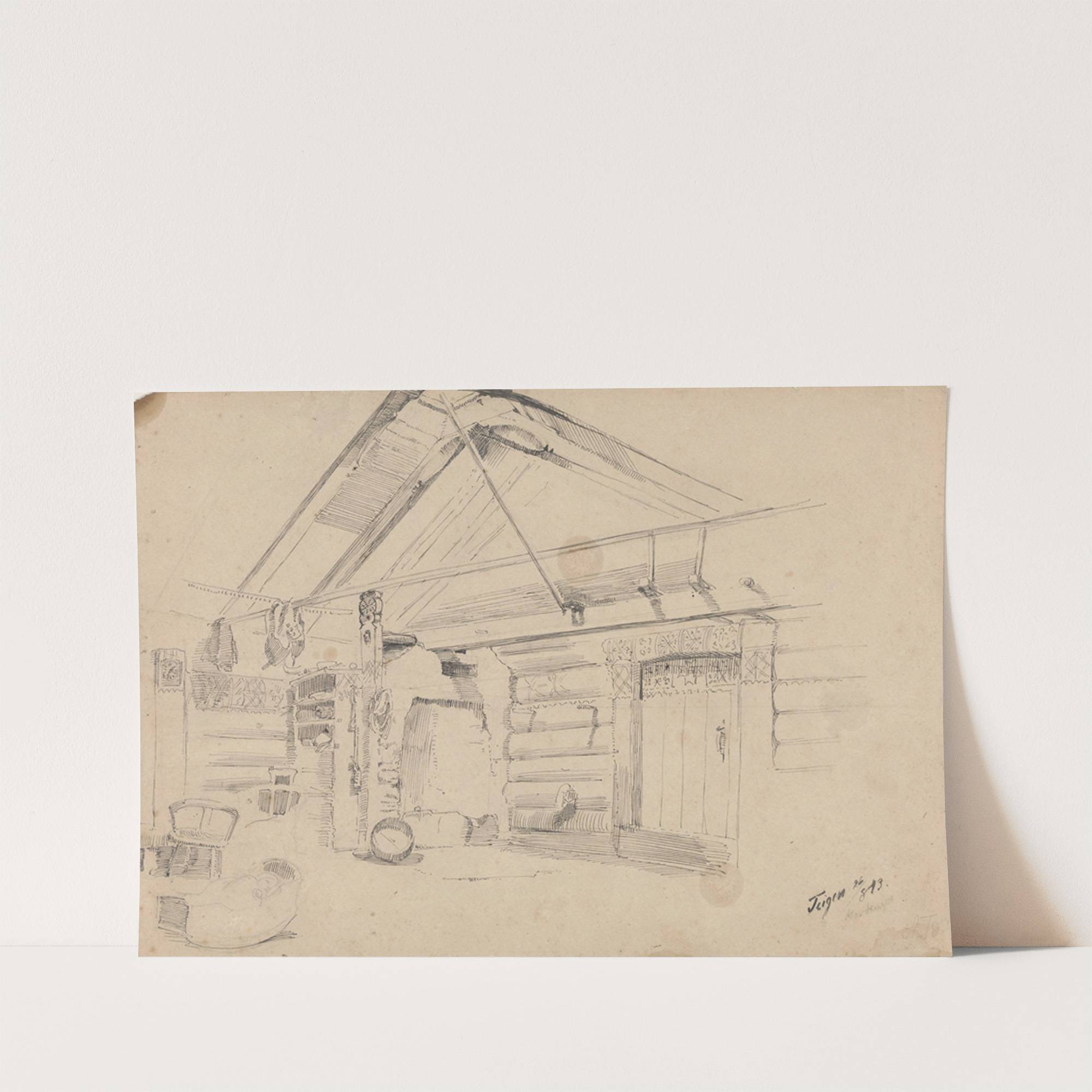 This stunning black-and-white sketch captures the interior of an old-fashioned woodworking shop with remarkable detail. Drawn using fine pencil strokes, the artwork showcases a rustic, timber-built structure that features a prominent peaked roof supported by sturdy beams and trusses. The...