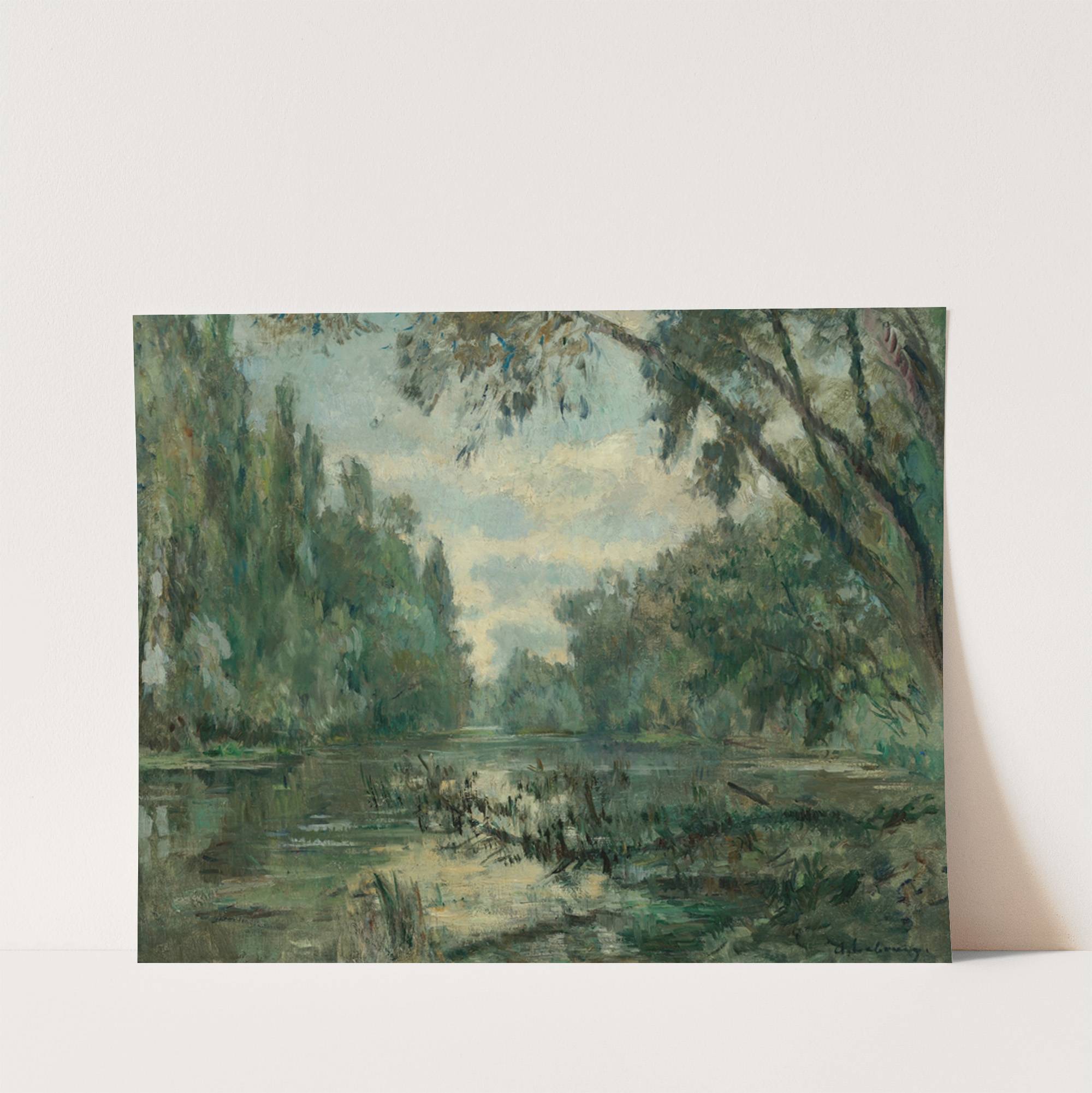 This landscape painting by Albert Lebourg captures the serene beauty of a forest riverside scene in impressionist style. The composition features a calm river that reflects the soft hues of the surrounding greenery. On both sides of the river, tall...