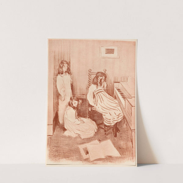 This monochromatic sepia-toned print by Alfredo Müller captures a poignant, introspective scene featuring three women in a modest interior setting. The composition is richly detailed with cross-hatching techniques that lend texture and depth to the artwork.In the foreground, one woman...