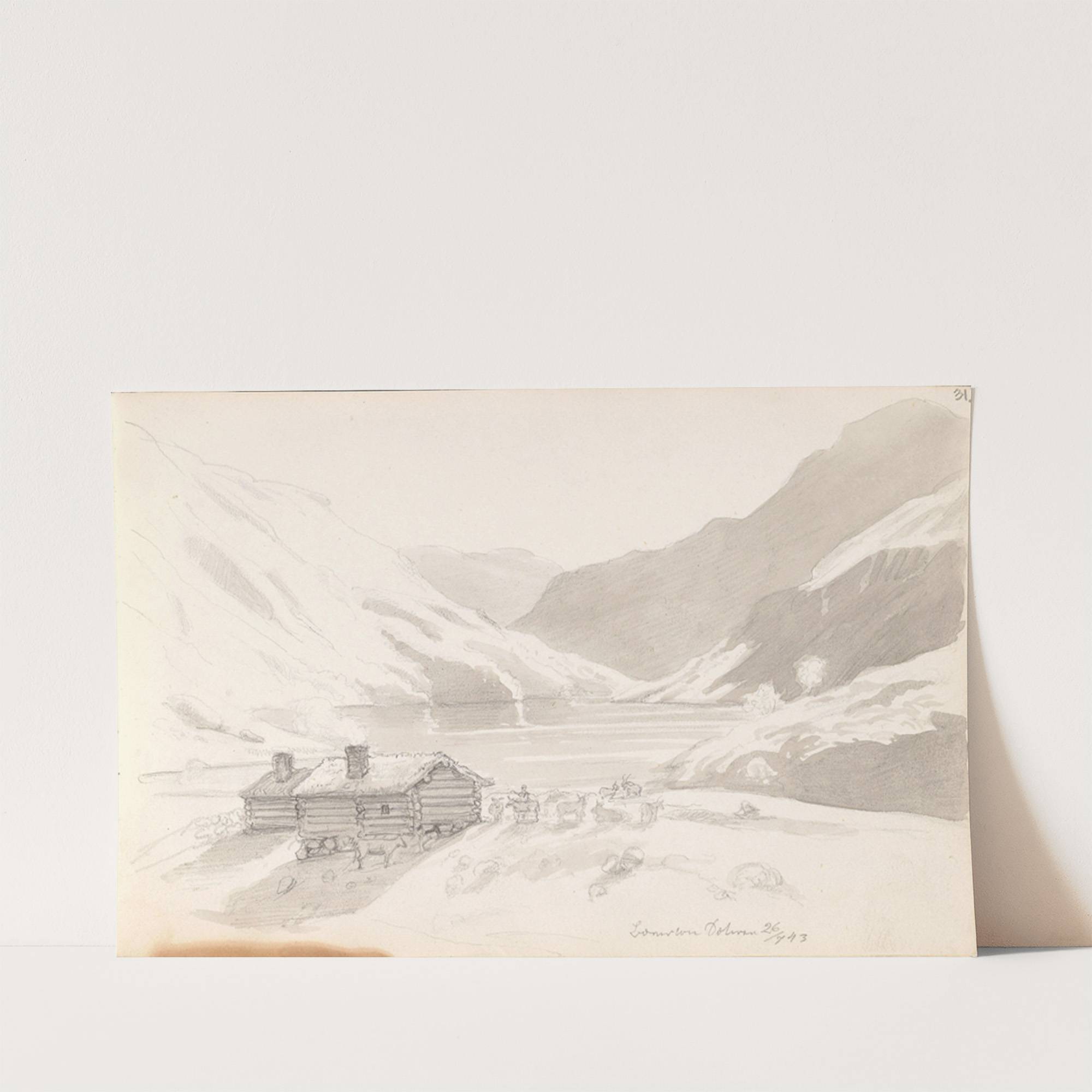 This exquisite print features "Bøvertun (1843)" by the renowned artist Adolph Tidemand, capturing a serene winter landscape with remarkable precision. The composition centers around a small, charming house nestled in a snowy mountainous terrain. The building is delicately rendered in...