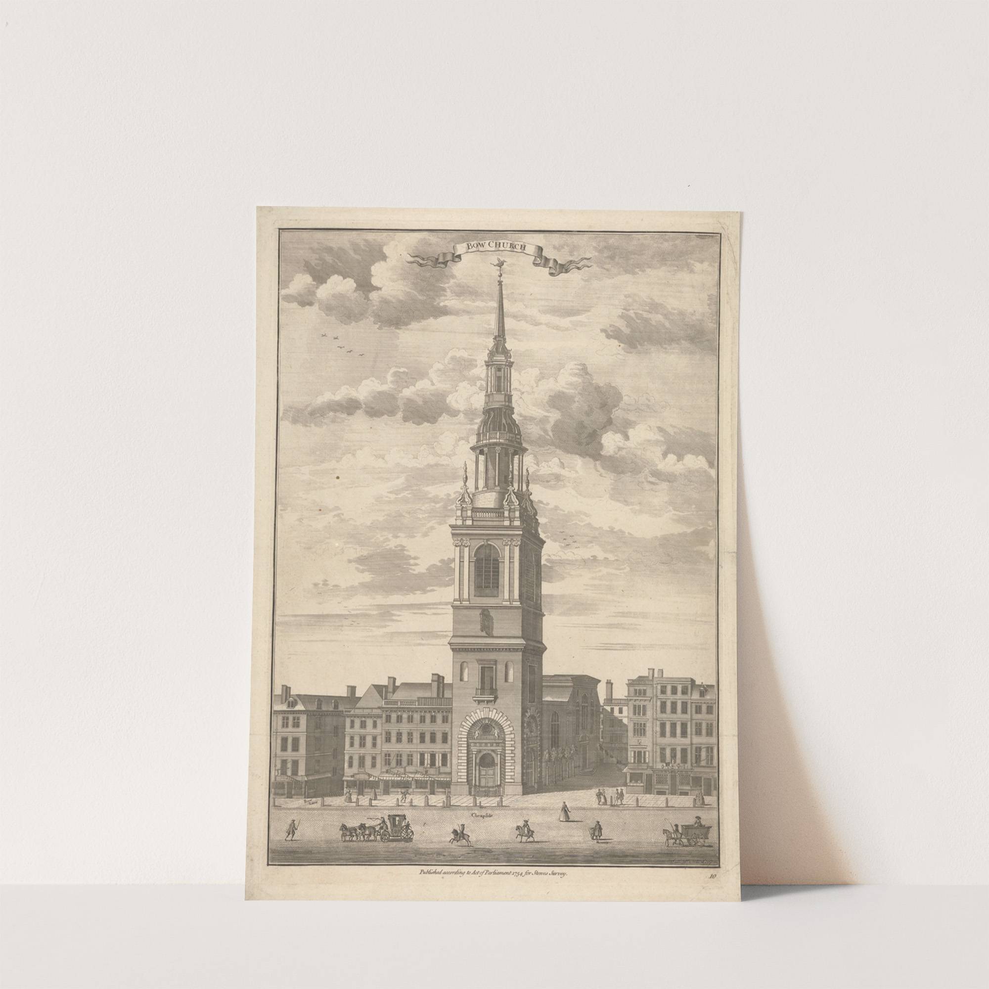 This exquisite black and white etching captures the historic elegance of Bow Church, a masterpiece by Sutton Nicholls. The central focus is the towering church steeple, adorned with intricate architectural details and topped with a small cross and banner that...