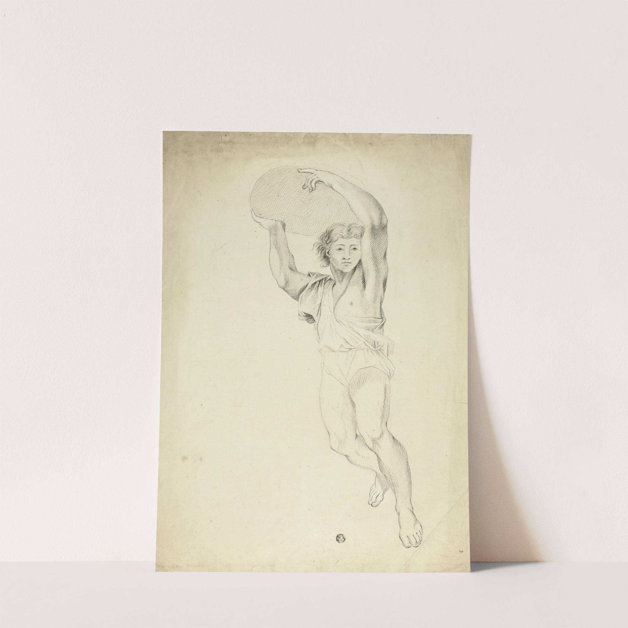 This elegant black-and-white art print features "Boy Carrying Weight" by the renowned artist Charles Le Brun. The detailed pencil drawing showcases a young boy with an athletic build, gracefully suspended in mid-air while carrying a large circular object on his...