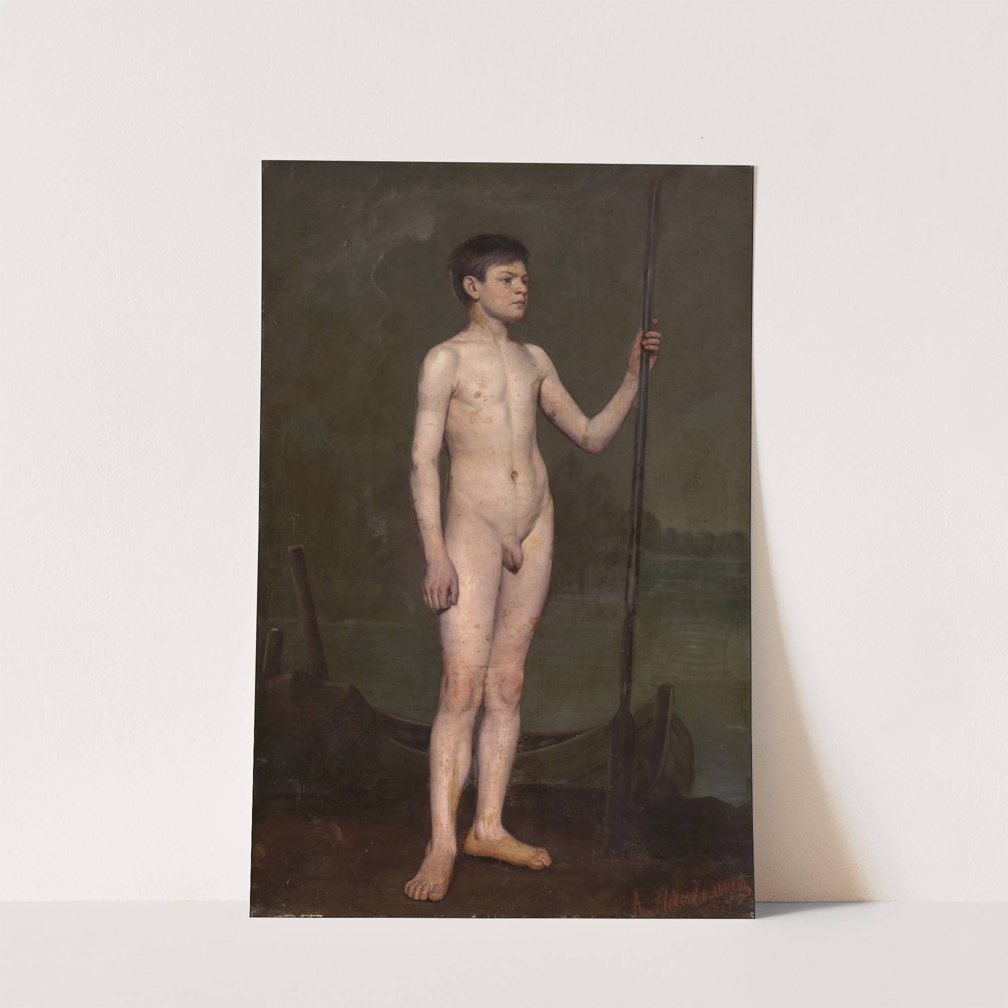 This captivating art print features "Boy with an Oar" by Alexander Nikanorovich Novoskoltsev, showcasing a young male figure in a nude stance. The boy stands tall and is depicted from the front, holding a long oar in his right hand,...
