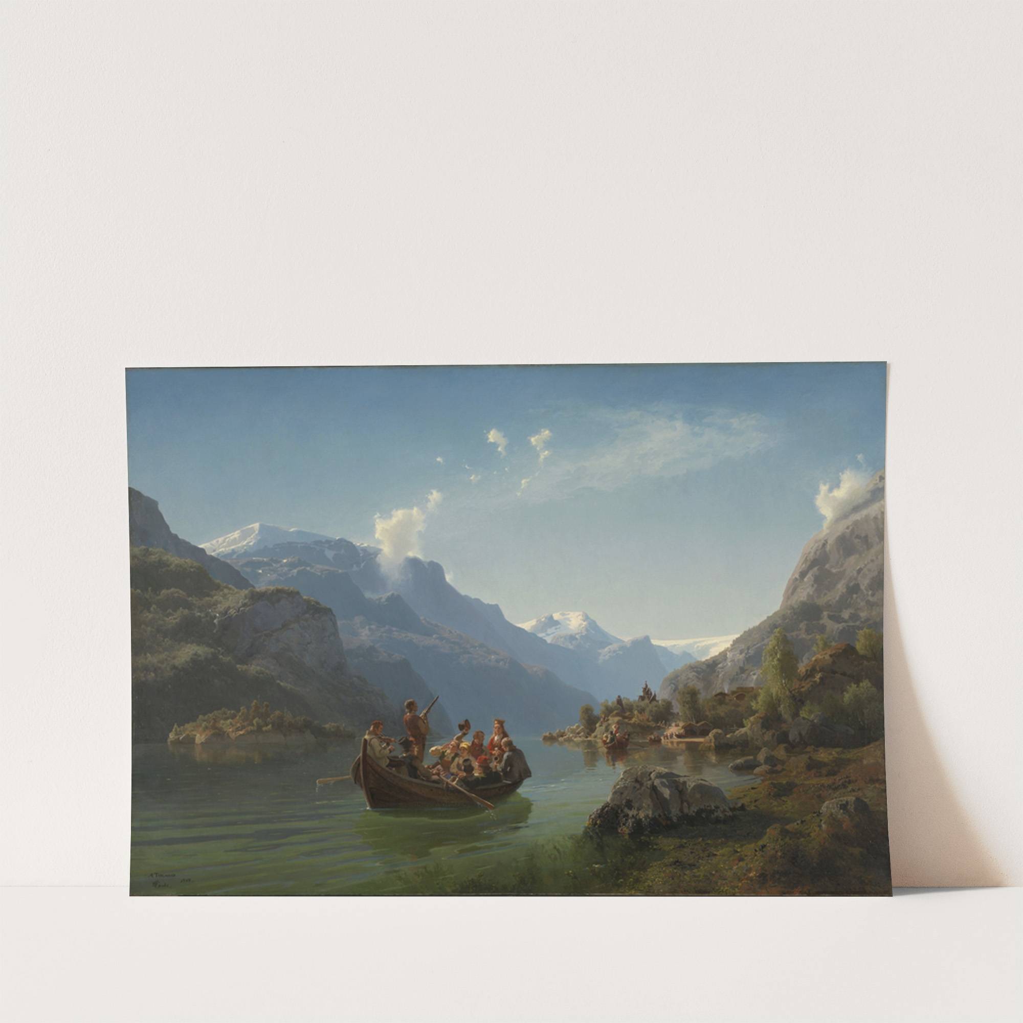 Experience the serene beauty of 19th-century Scandinavian wilderness with "Bridal Procession on the Hardangerfjord," an exquisite art print by Adolph Tidemand. This captivating image captures a group of people in traditional Viking attire rowing a wooden boat across a tranquil...