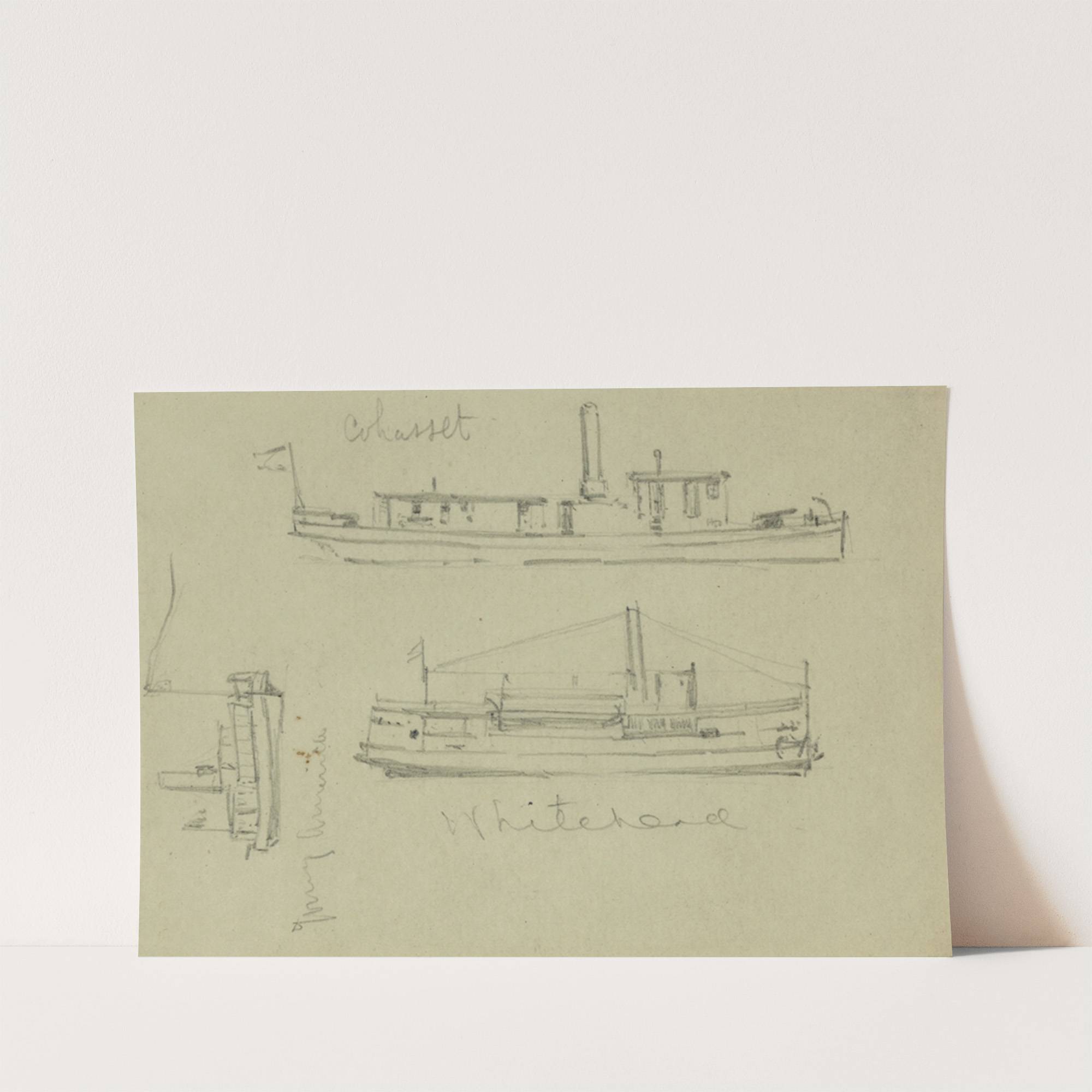 Broadside views of the Whitehead, Cohasset, and Young America by Alfred Rudolph Waud