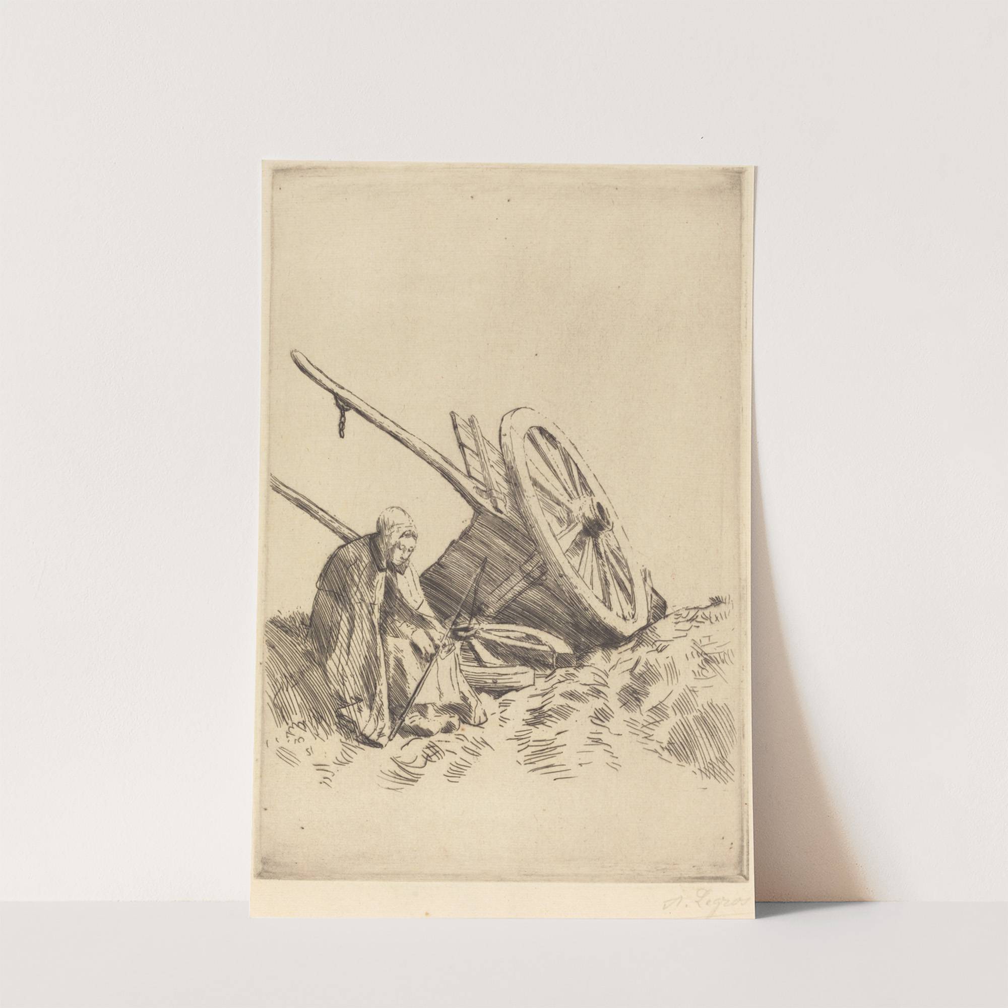This exquisite print captures the timeless artwork "Broken Cart" by Alphonse Legros. Executed in fine monochromatic ink, this piece features a poignant rural scene. An elderly woman with a shawl and long hair sits on the ground to the left...
