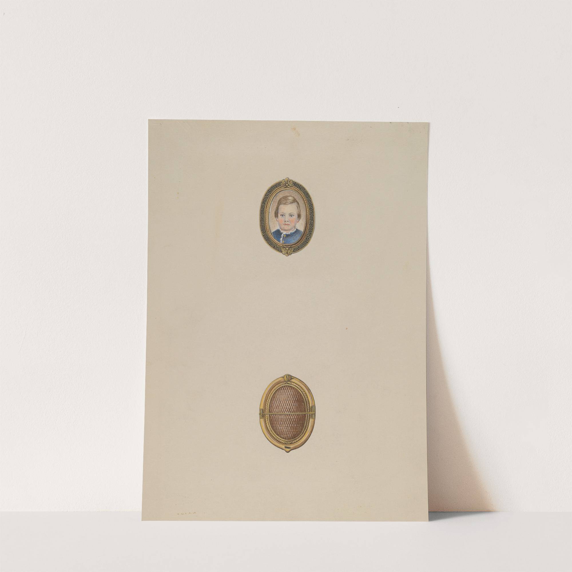 Introducing "Brooch by Bertha Semple," a charming piece of art that combines vintage elegance with delicate charm. This artwork features two distinct circular elements set against a pale, off-white background.At the top center, there is a beautifully rendered portrait of...