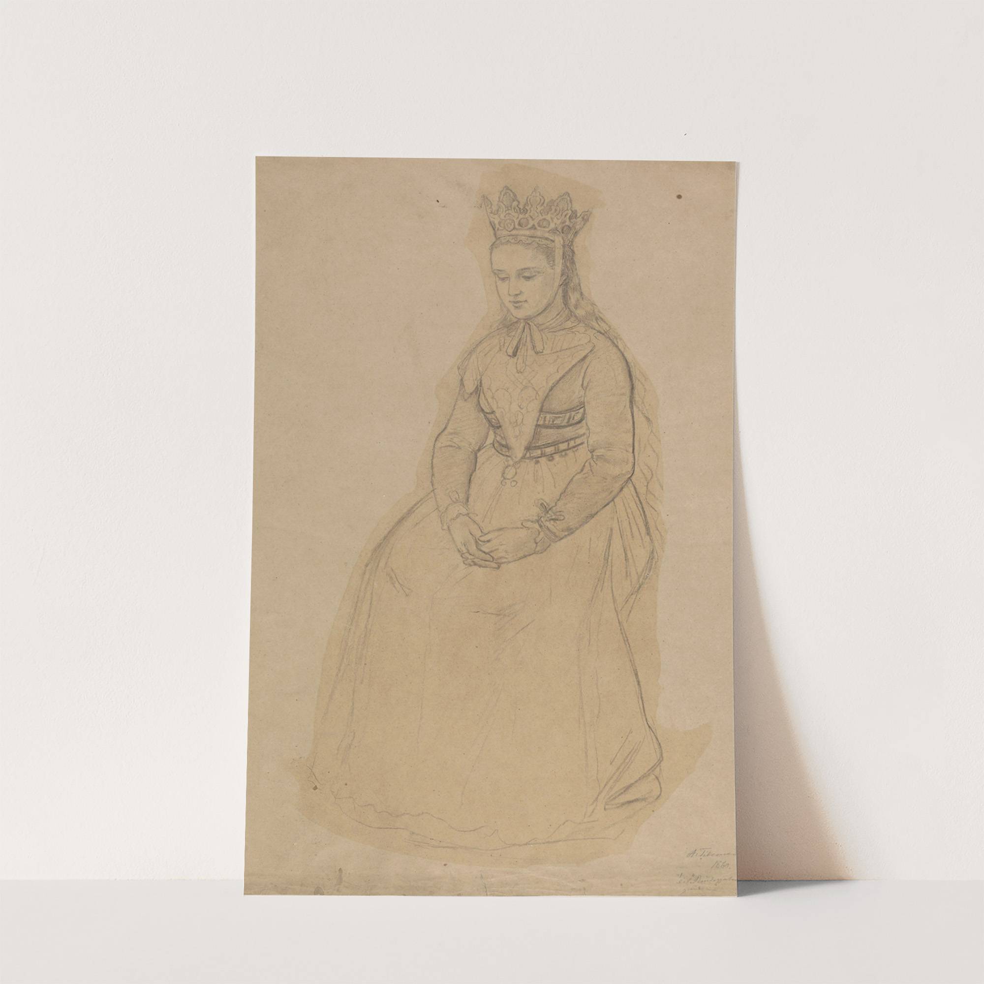 This elegant art print features a delicately sketched portrait of a regal woman from the mid-19th century, created by artist Adolph Tidemand. The monochromatic drawing is rendered in soft pencil on textured beige paper, lending it a timeless quality and...
