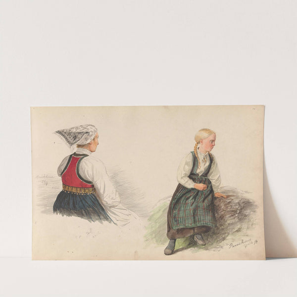 This beautifully rendered artwork captures two young women in traditional Norwegian folk attire, illustrated with delicate, watercolor-like precision. The artist, Brudekone Dønaat Anfinnsdatter Opheim, skillfully depicts the timeless elegance of this classic Nordic style. On the left, one woman is...
