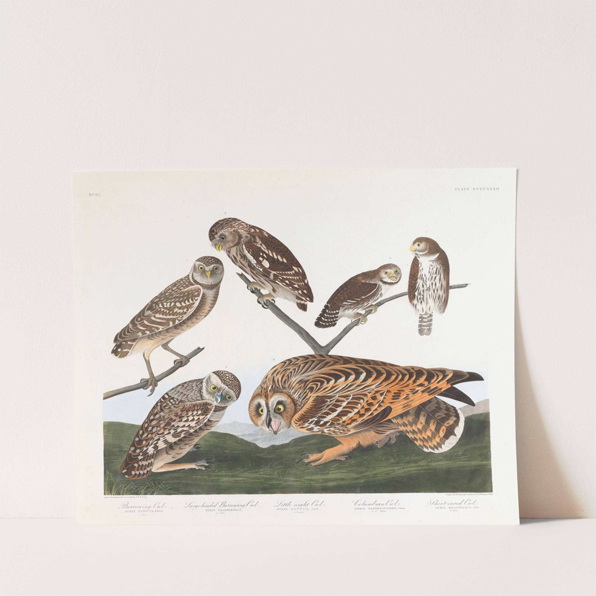 Burrowing owl. Large-headed burrowing owl. Little night owl. Columbian owl. Short-eared owl by John James Audubon - Wall Art Print