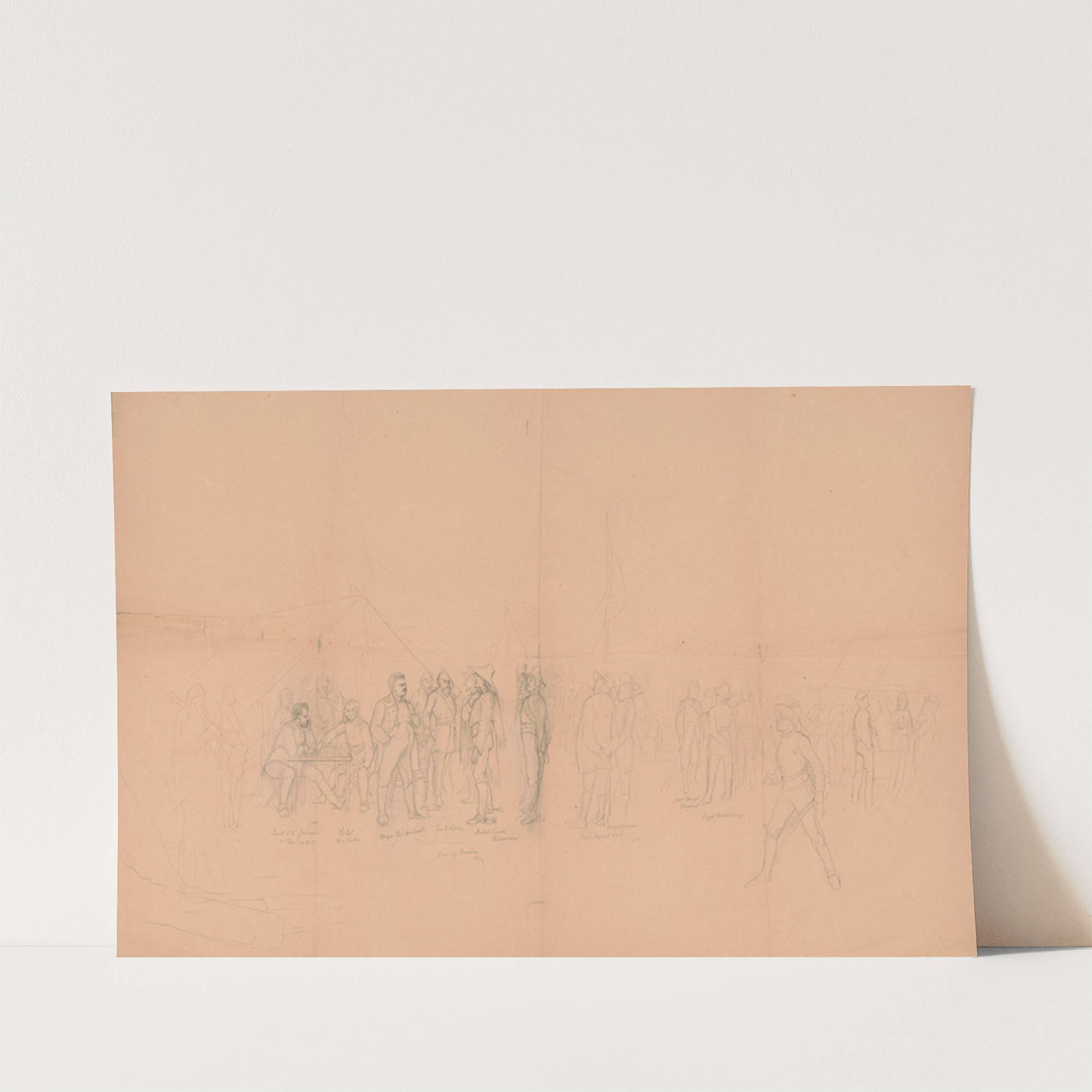 This art print features "Camp Nevin, Kentucky" by Adolph Metzner, showcasing a delicate pencil sketch of a bustling camp scene. The image is primarily composed of fine, light pencil lines on a soft peach-colored background, providing a warm and inviting...
