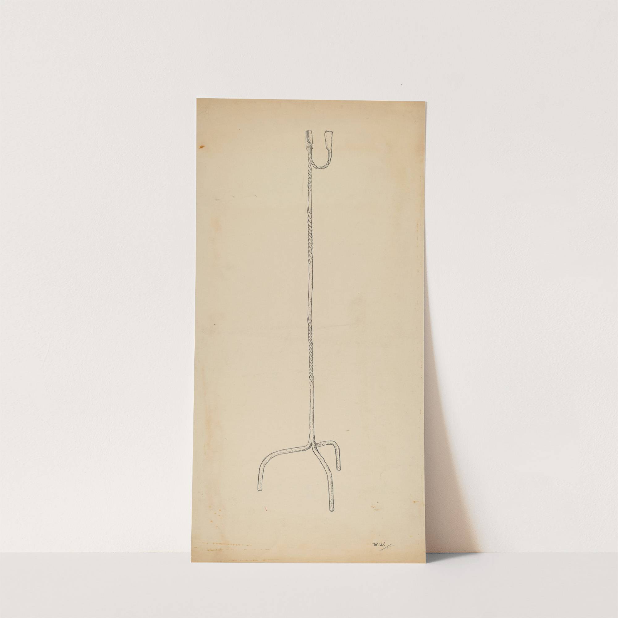 This minimalist line drawing captures the simplicity and elegance of a classic candle holder. Rendered in black ink on a lightly yellowed background, the image features a tall, slender stem that curves gracefully into two curved handles at the base,...