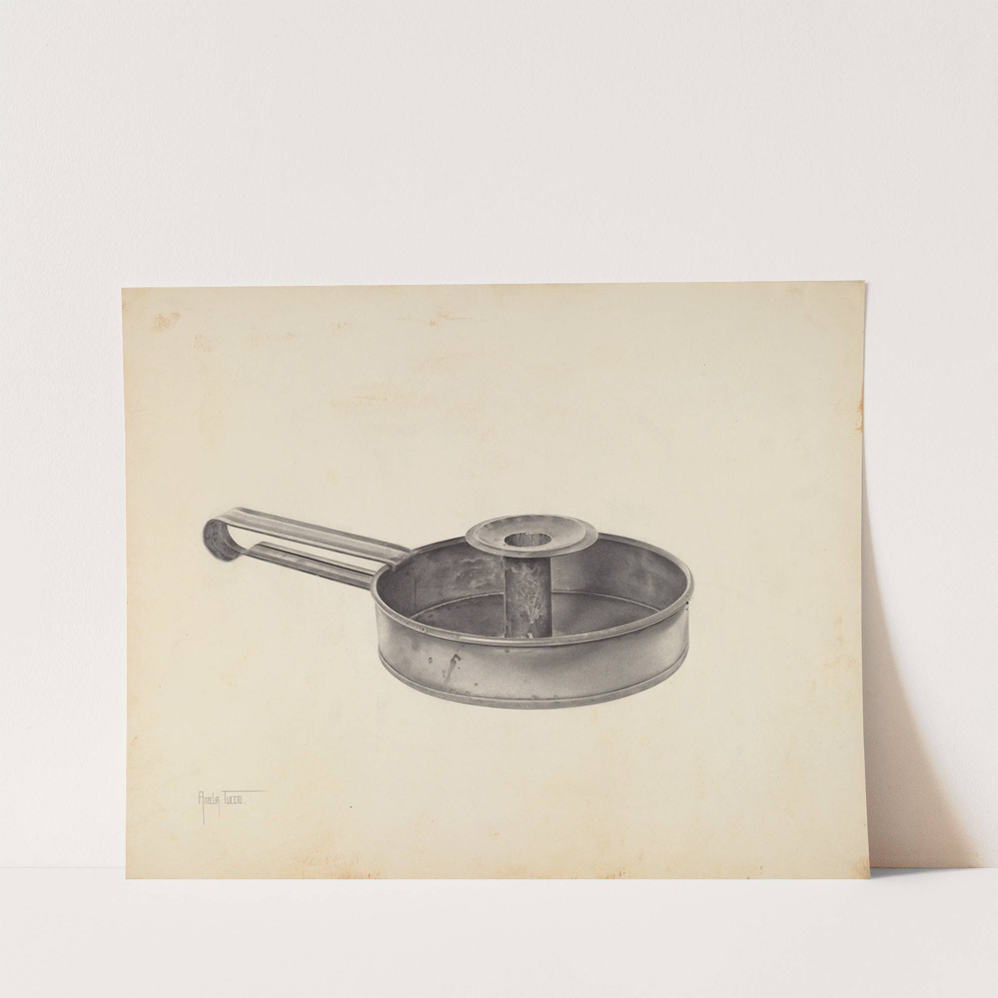 This artwork showcases "Candlestick" by Amelia Tuccio in a detailed, realistic style. The piece features a simple yet evocative representation of an old-fashioned metal frying pan, centered against a clean, white background. The frying pan has a worn, slightly tarnished...
