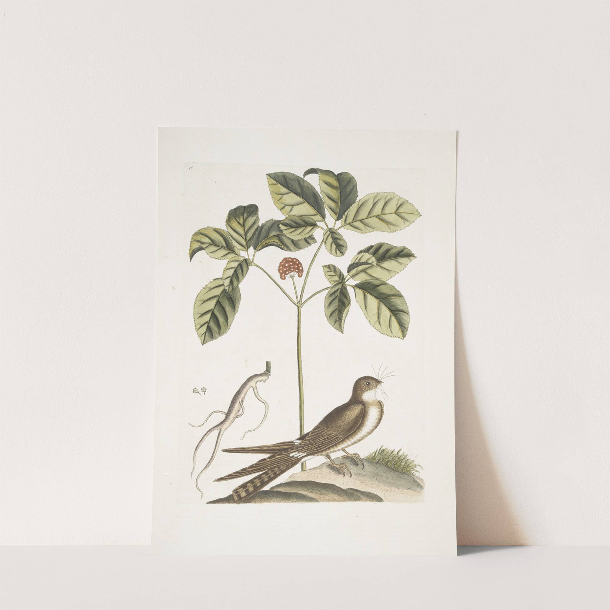 Caprimulgus minor Americanus, The Whip-poor-Will; Aureliana Canadensis, The Ginseng, or Ninsin of the Chinese. by Mark Catesby - Wall Art Print