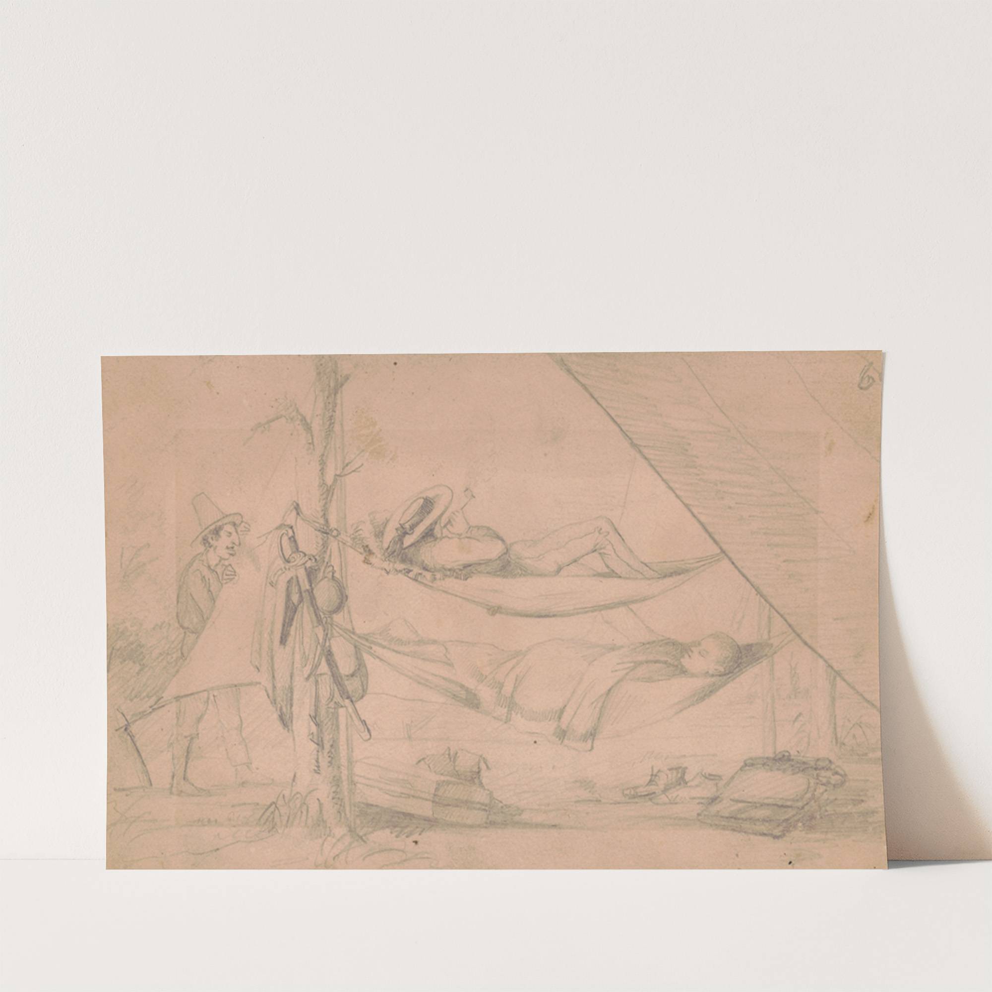 This exquisite pencil drawing by Captain Adolph Metzner features a historical scene set in mid-19th century America. In the foreground, an elderly man stands to the left, dressed in period clothing with a hat and cloak. He holds a rifle...