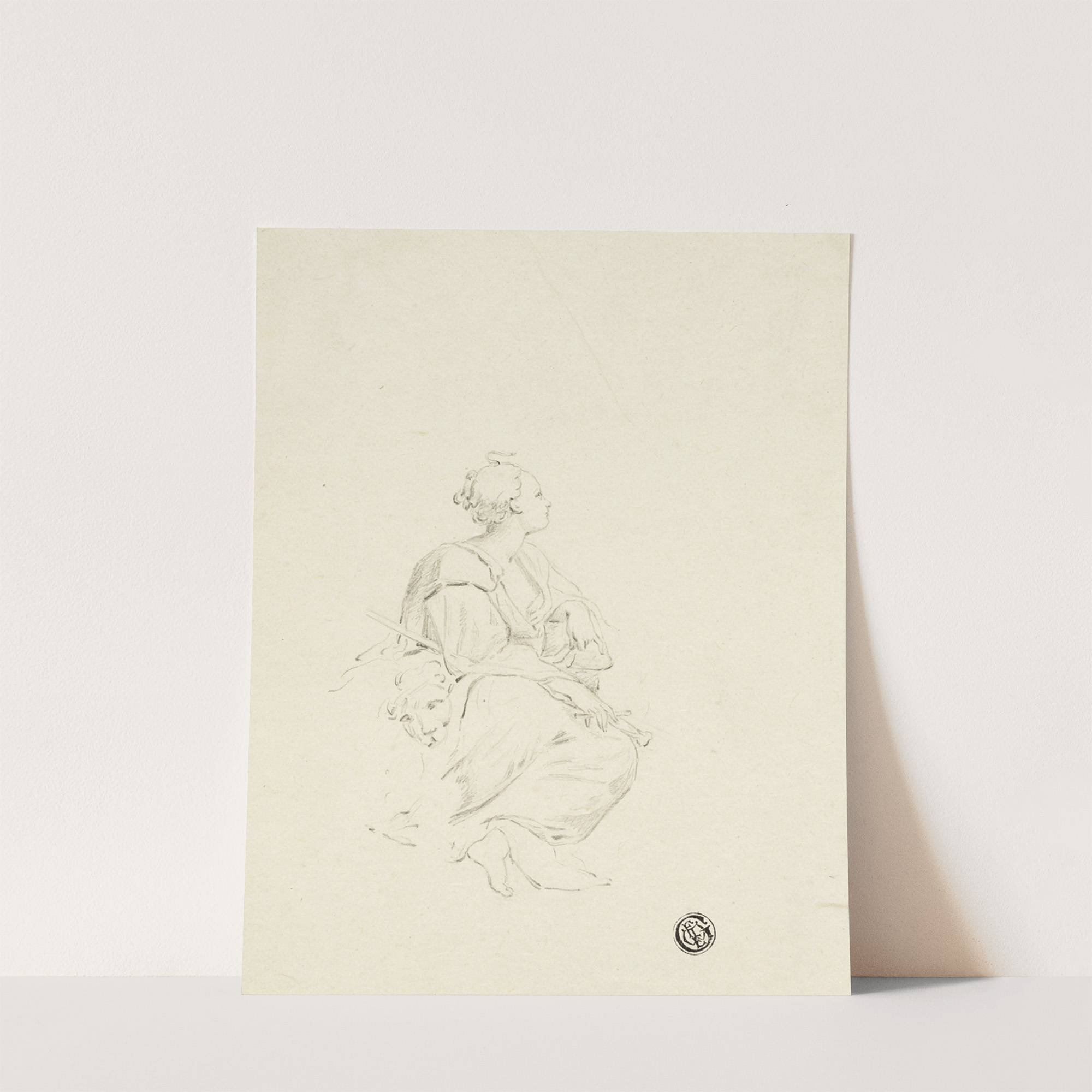 This delicate line drawing showcases "Cardinal Virtues or Saint Euphemia" by After Correggio. Rendered in a minimalist, monochromatic style, the image features a gentle, seated figure with soft, flowing lines that capture the grace and elegance of classical art. The...