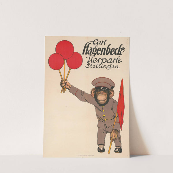 This vibrant print features an anthropomorphic chimpanzee dressed in a military-style uniform, complete with a matching cap. The chimp's uniform is depicted in shades of gray with button details and black shoes. He holds three bright red balloons in his...