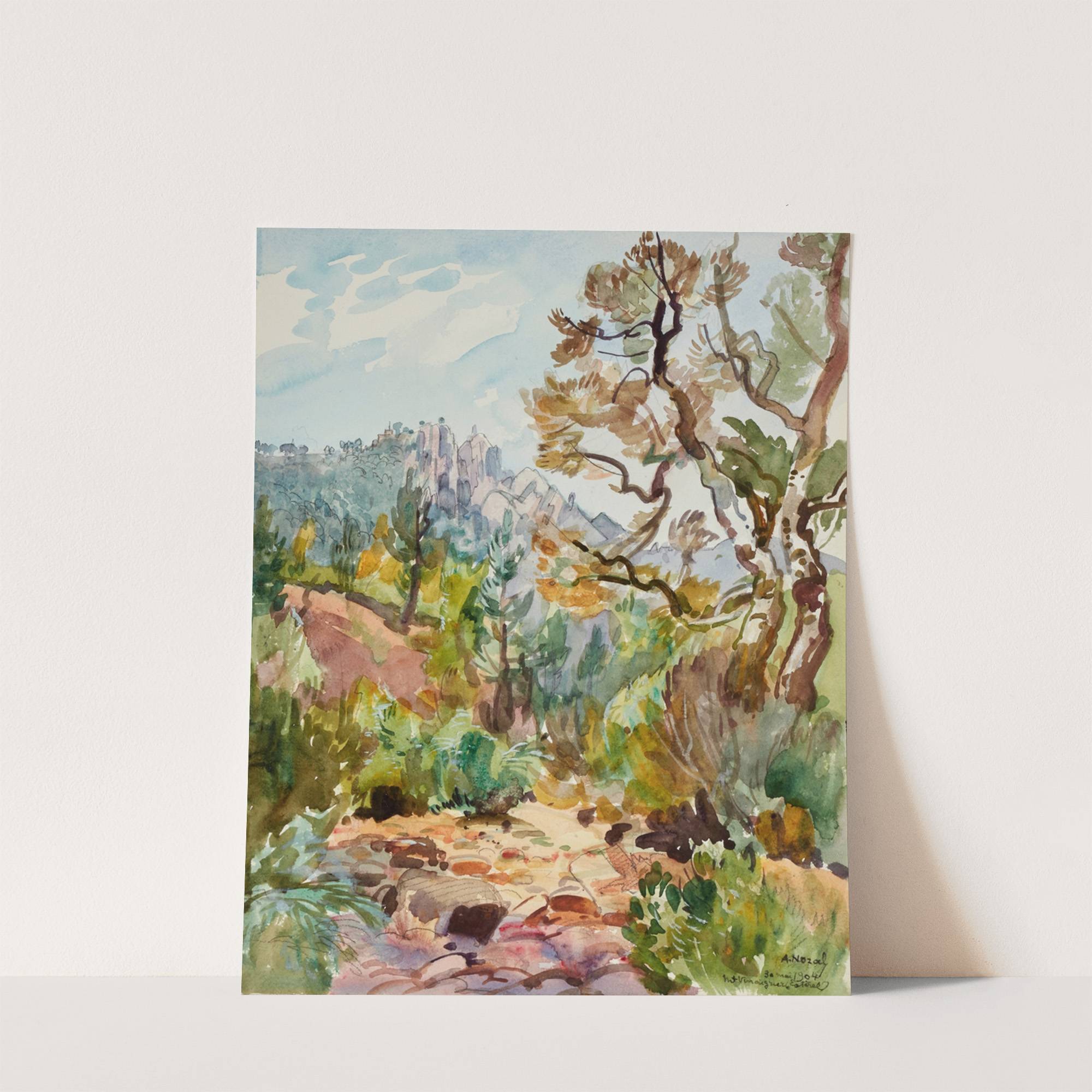 This vibrant landscape painting captures the serene beauty of a sunlit forest path winding through a lush, mountainous terrain. Created in 1908 by Alexandre Nozal as part of his "Carnet de Dessins" series, this watercolor artwork bursts with rich, natural...