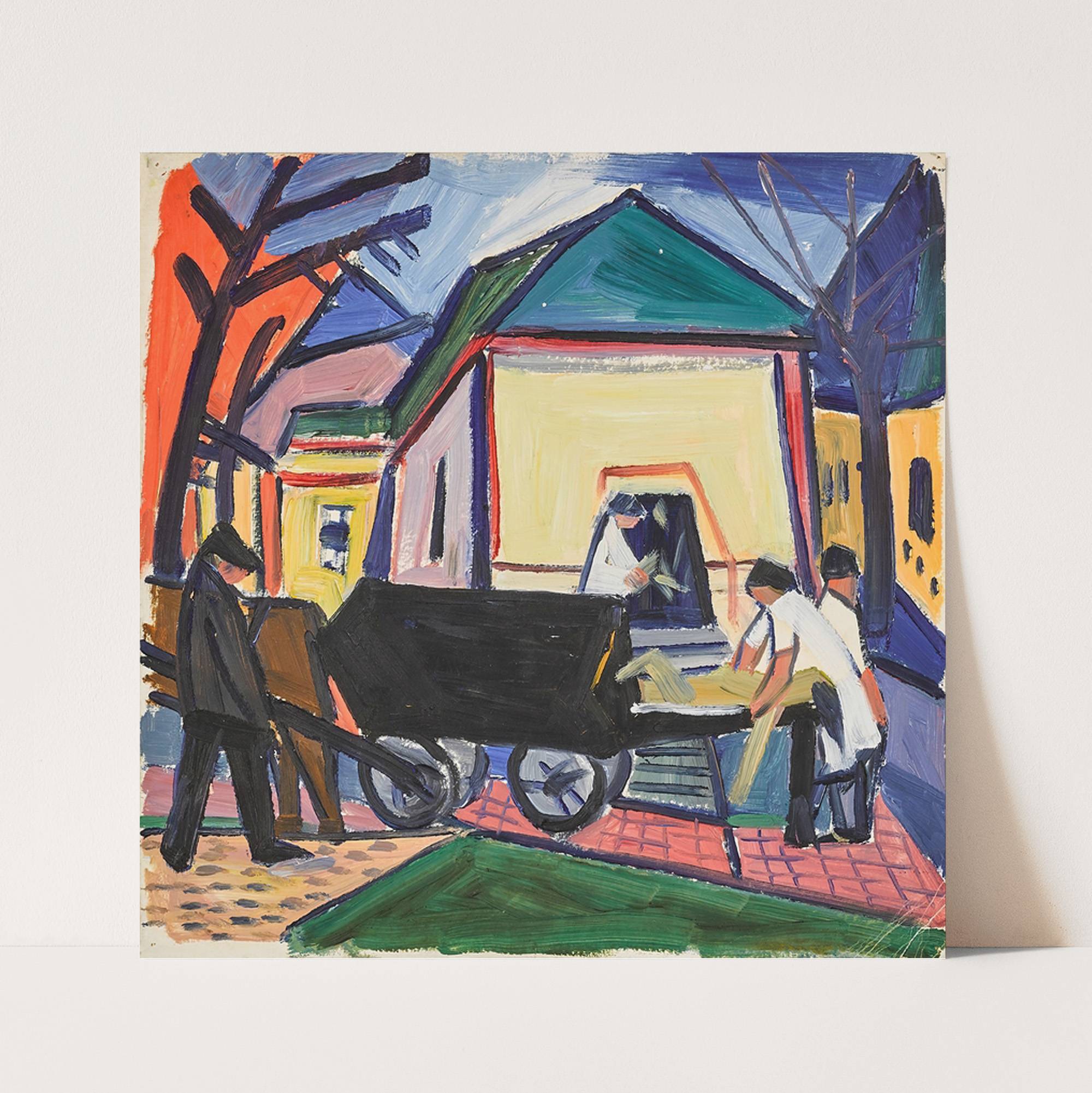 This vibrant artwork titled "Cart" by Alexander Konstantinovich Bogomazov features an expressive, abstract style with bold, dynamic brushstrokes and a vivid color palette. The scene depicts a rustic outdoor setting where two men are handling a black cart or wagon....