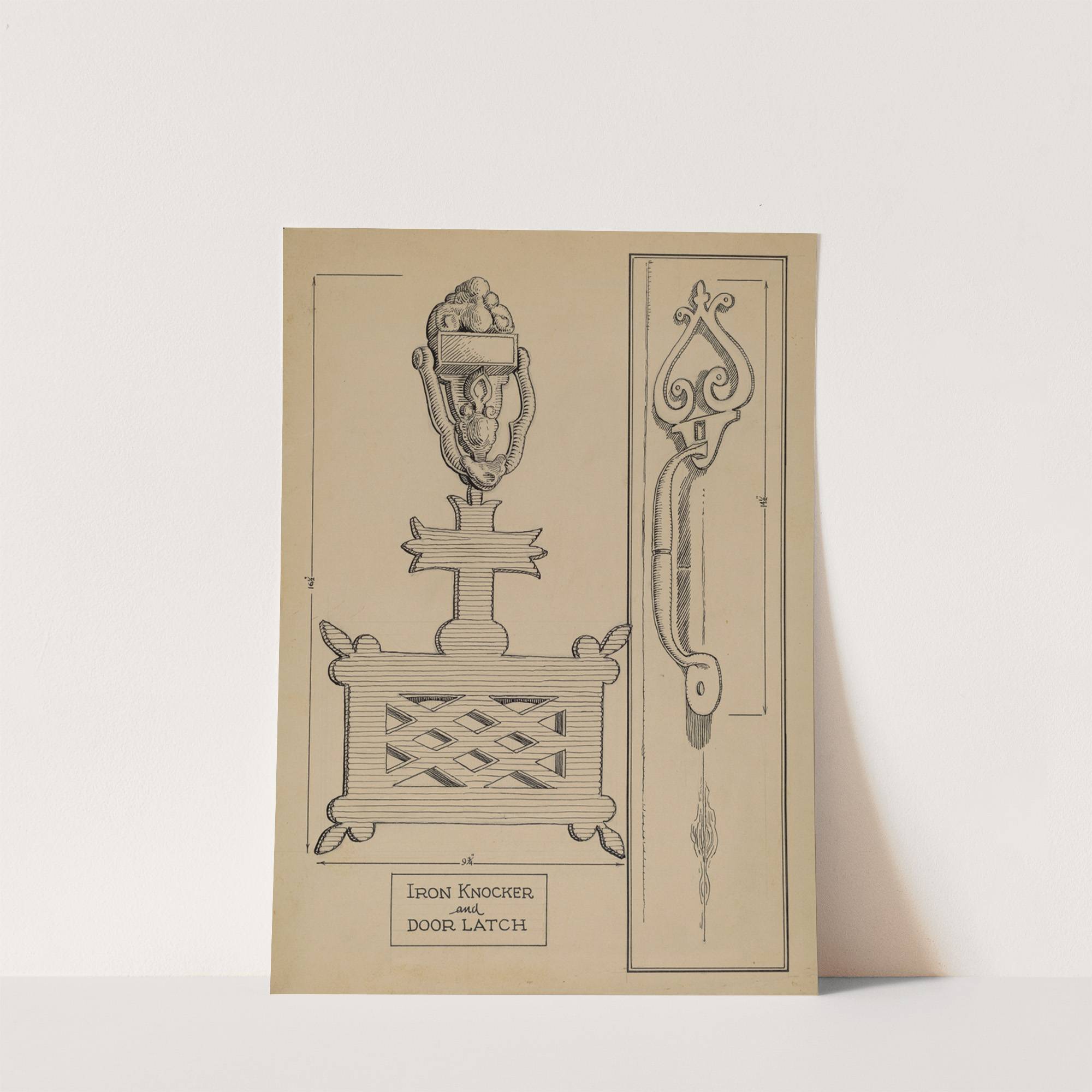 This intricate black and white illustration showcases an ornate medieval knocker latch, rendered with precise line work typical of antique architectural drawings. The main subject is an intricately designed door latch featuring a central decorative element resembling a stylized face...