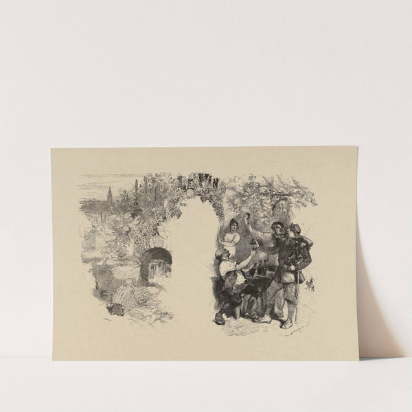 Experience the timeless charm of French impressionism with "Ce que l'on boit le vin" (1880) by Edmond Morin. This evocative black and white print features a group of five individuals gathered closely together in conversation, set against an intricate, textured...
