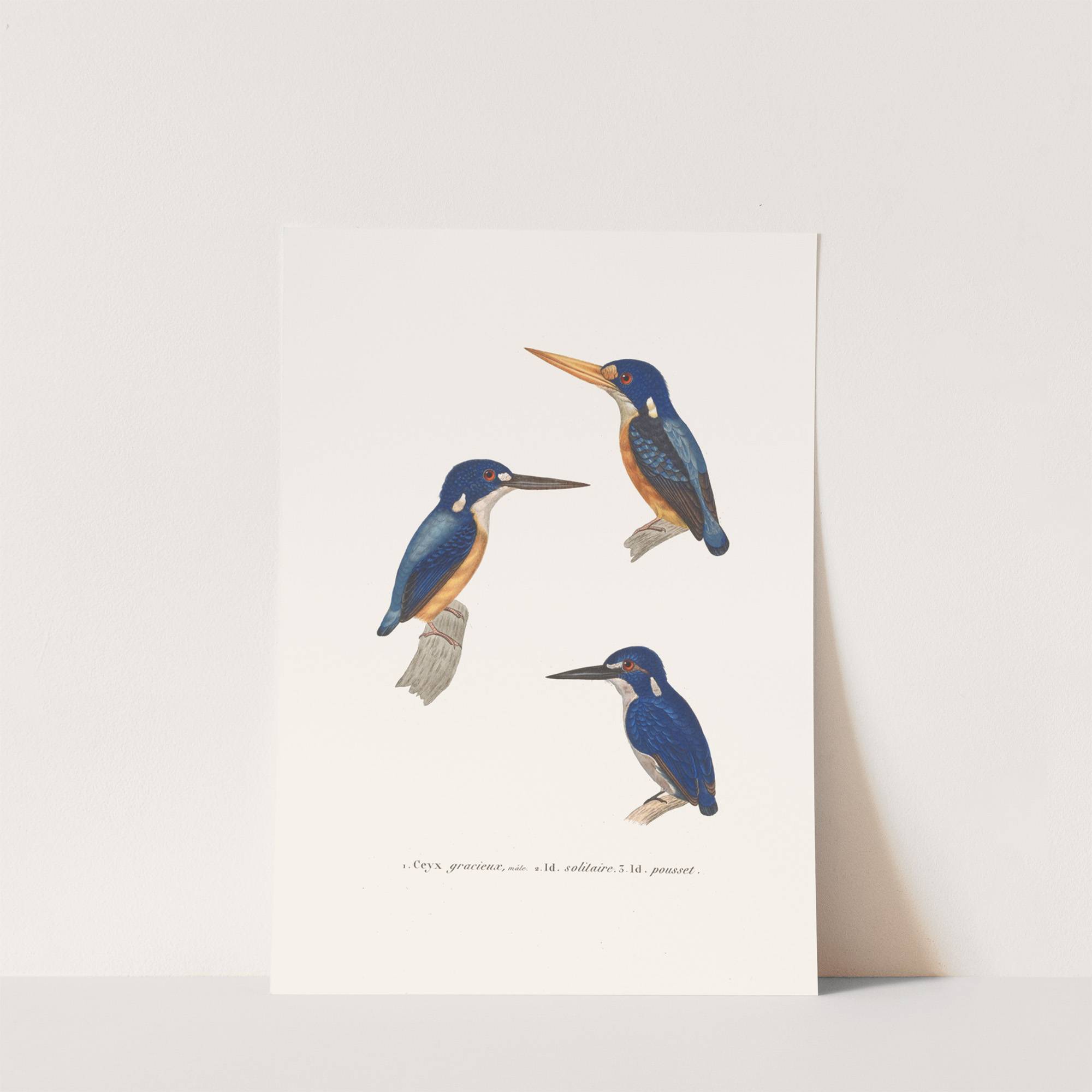 This art print features three beautifully illustrated European Kingfishers, rendered in vibrant, meticulous detail. The artist, Coenraad Jacob Temminck, has captured the striking plumage of these birds with precision and elegance. Each bird displays a brilliant blue upper body, contrasted...