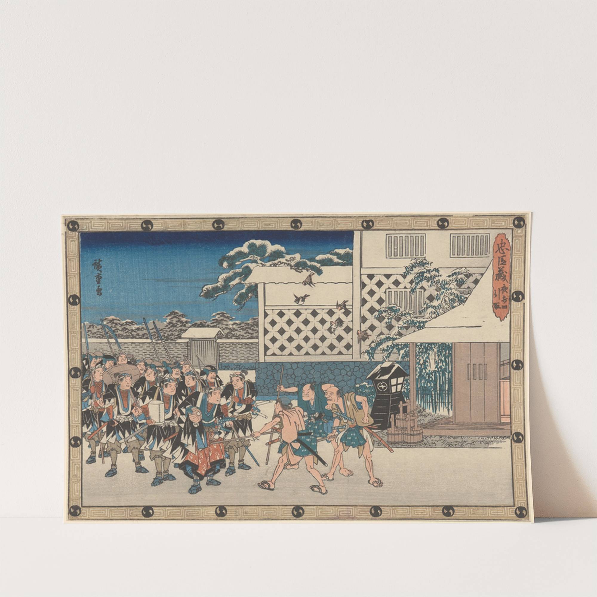 This vibrant Ukiyo-e print depicts "Challenging the Guards" by renowned artist Andō Hiroshige. The scene bursts with color and dynamic motion, featuring a group of samurai warriors in traditional attire, each adorned in black, white, and red kimonos. They are...