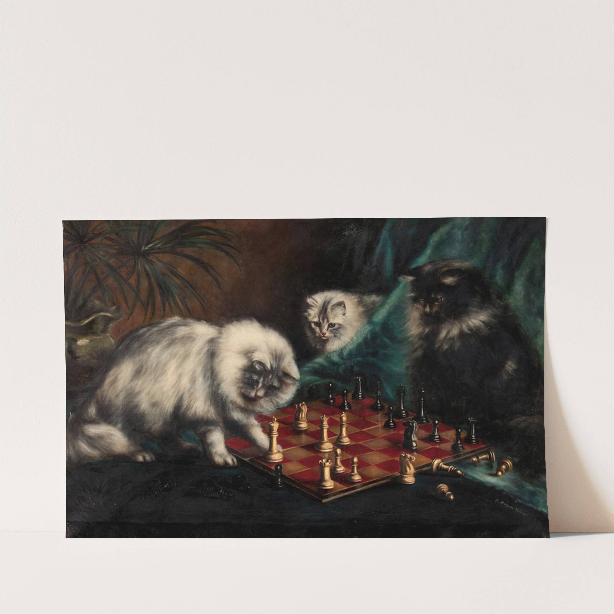 This captivating print titled "Checkmate" by Agnes Augusta Talboys showcases three fluffy cats deeply engrossed in an intense chess match. The composition is rich with dark, moody hues of black and brown, contrasted by the vivid red and golden checkered...