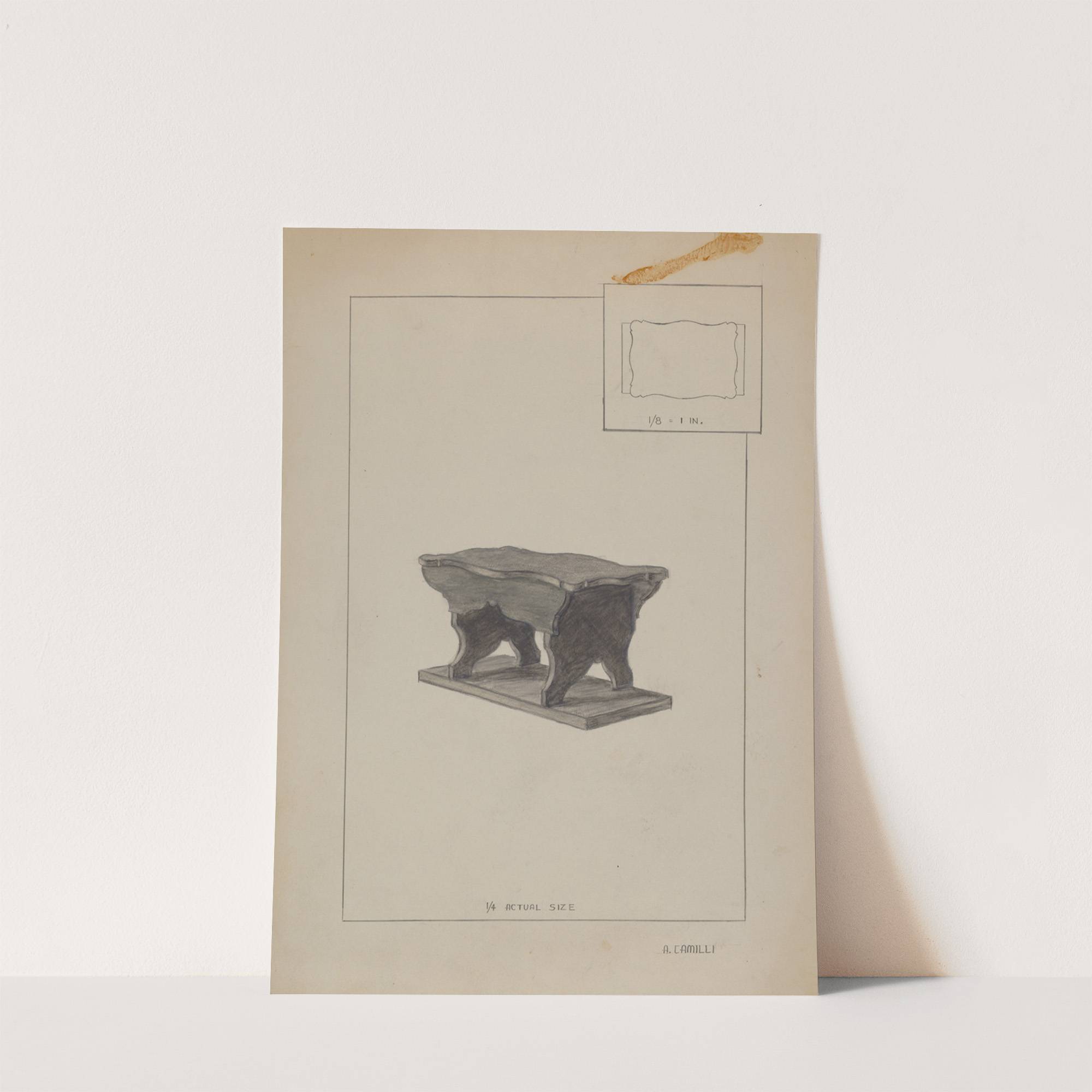 This elegant art print showcases "Child's Bench" by the renowned artist Albert Camilli. The image features a detailed watercolor illustration of a simple yet sturdy wooden bench with rounded edges and robust legs, rendered in deep shades of blue and...
