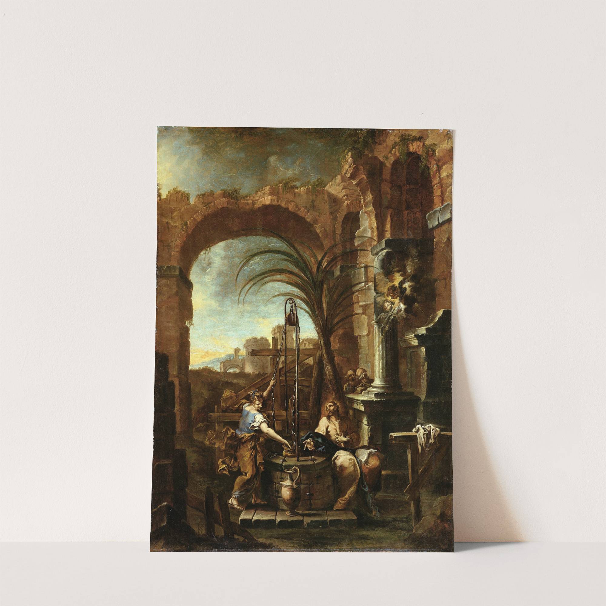 This stunning art print features "Christ and the Samaritan Woman" by Alessandro Magnasco, showcasing a dramatic Baroque-style scene. The composition is filled with rich, dark hues of brown and black, contrasted by a vibrant, luminous sky in the background. Architectural...